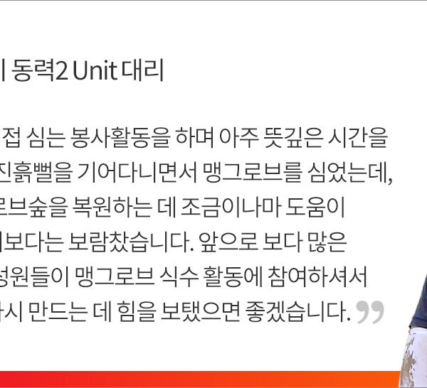 이번 봉사활동에 참여한 구성원들은 한 목소리로 맹그로브 식수 활동에 직접 참여해보니, 맹그로브숲이 지구 환경에 얼마나 큰 기여를 하고 있는지 의미 있게 다가왔다고 말했다.