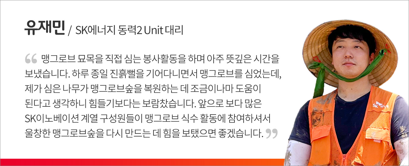 특히, 울산CLX 자원봉사단장으로 참여하게 된 SK에너지 박성길 원유·제품운영실장은 “울산CLX를 비롯한 SK이노베이션 계열의 모든 구성원은 탄소 감축을 위해 많은 노력을 하고 있다. 구성원들과 함께 회사의 실천적 ESG인 맹그로브 식수 활동에 직접 참여하게 돼 더욱 의미 있었다”며 “SK이노베이션 계열의 사회공헌 및 이산화탄소 저감 활동이 계속해서 발전해 나가길 바란다”고 말했다.