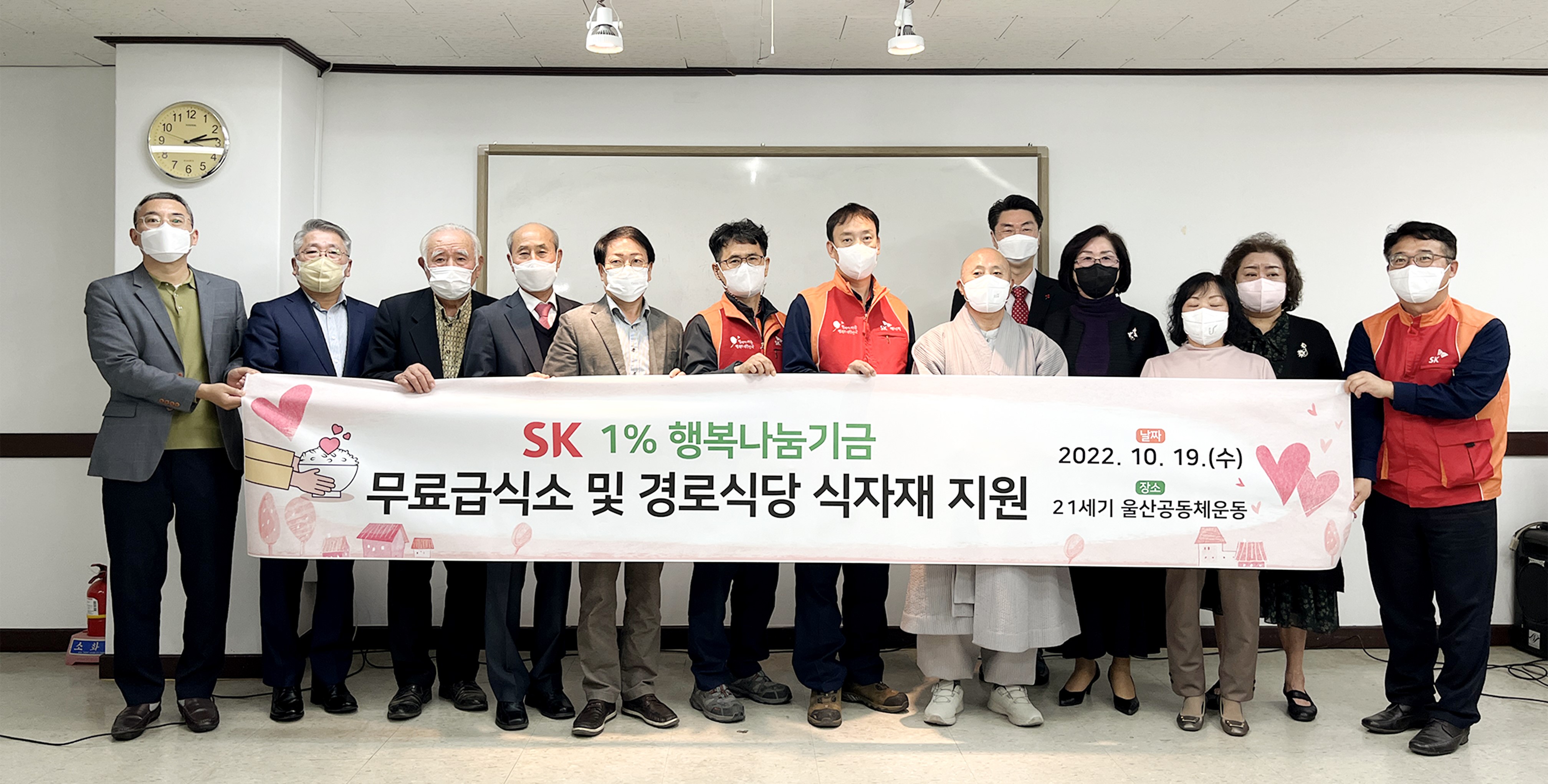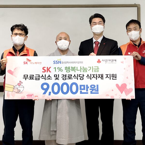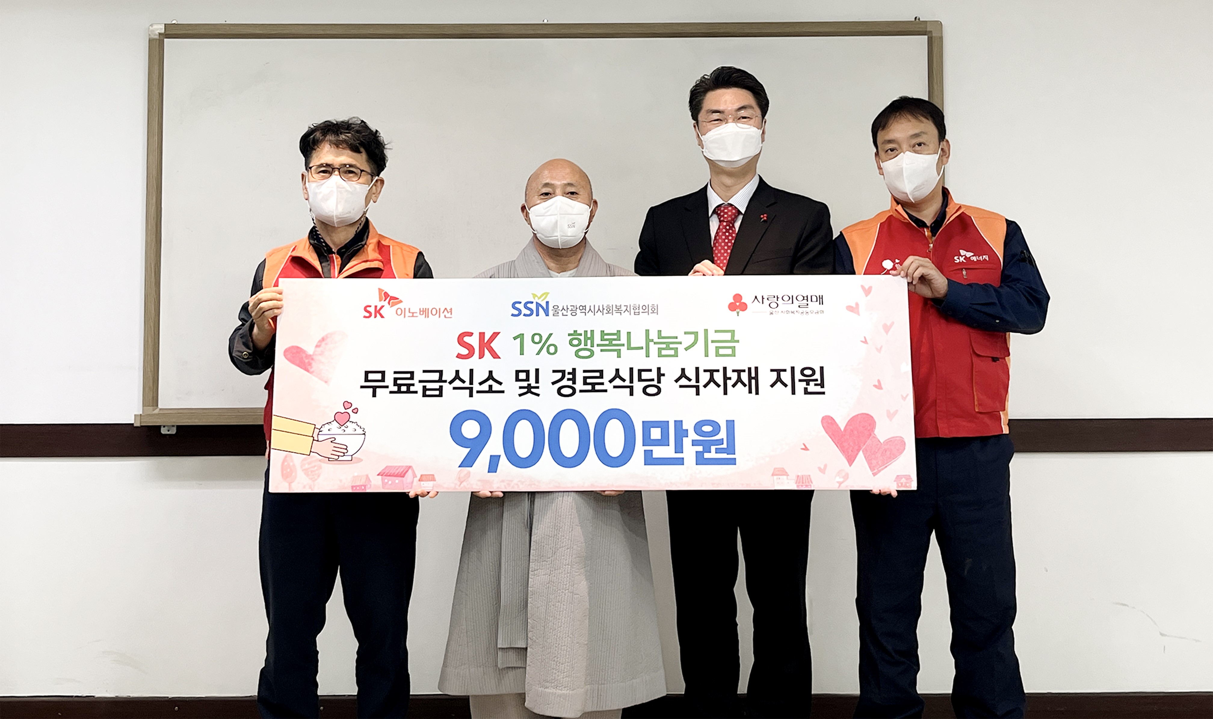 SK이노베이션 울산Complex(총괄 부사장 유재영)가 19일 오후, 울산광역시 관내 무료급식소 및 경로식당에 식자재 지원 성금 9천만원을 전달했다.