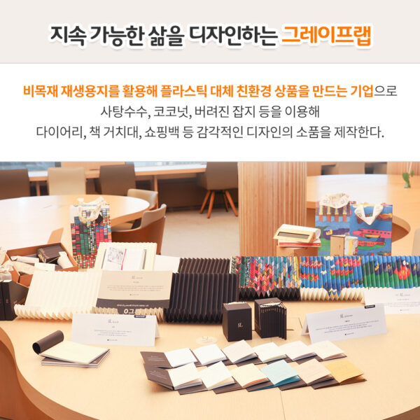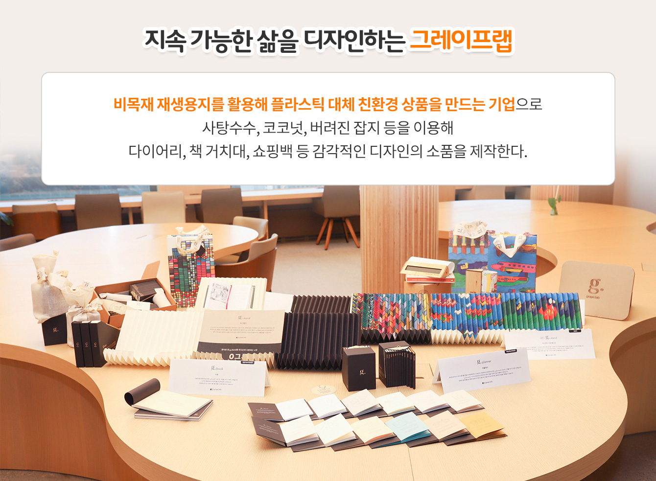 SK이노베이션이 육성 지원하는 ‘그레이프랩’은 사탕수수, 코코넛, 버려진 잡지 등을 이용해서 다이어리, 노트북 거치대, 책 거치대, 쇼핑백 등 감각적인 디자인의 소품을 만드는 친환경 소셜벤처다.