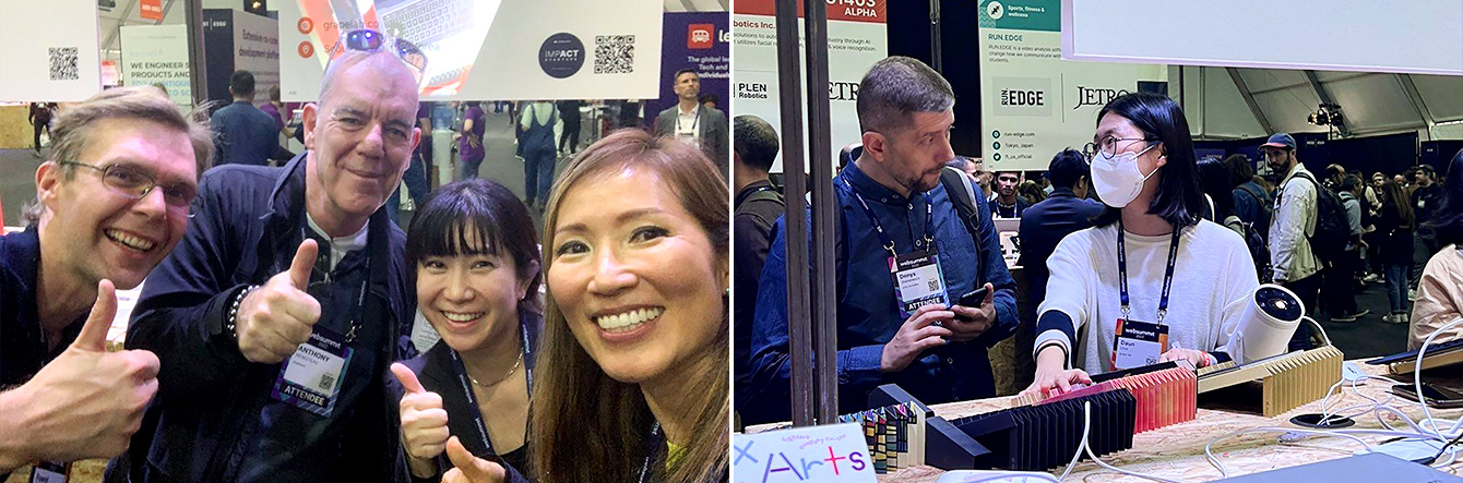 ▲ (좌) 유럽 최대 기술 컨퍼런스인 ‘웹서밋 2022’에 참가한 친환경 소셜벤처 그레이프랩의 전시 부스 / (우) 그레이프랩 관계자(앞줄 오른쪽에서 첫 번째)가 그레이프랩의 전시 부스를 둘러보는 관람객에게 제품 설명을 하고 있다.