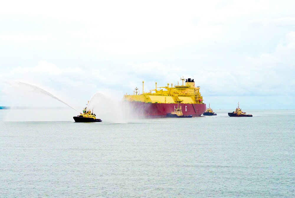 SK이노베이션 E&S의 LNG 수송선인 ‘프리즘 어질리티’호 앞에서 길잡이 역할을 하는 예인선이 바로사 가스전에서 생산한 LNG의 첫 선적을 축하하기 위해 워터캐논을 이용해 물대포를 쏘고 있다