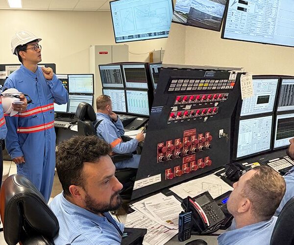 관제실 내 SK이노베이션 E&S 김종수 호주LNG사업팀장, 호주LNG사업팀 정성원 매니저 및 산토스 직원들이 LNG 선적량 등 선적 관련 내용을 확인하는 모습