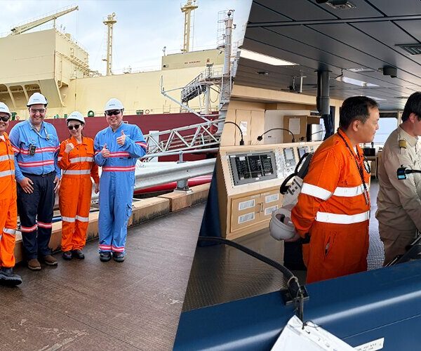 (좌) 출항 전 산토스 직원인 헤수스(가운데)와 SK이노베이션 E&S 구성원들이 함께 찍은 기념사진, (우) 출항 전 ‘프리즘 어질리티’호 조타실에서 SK이노베이션 E&S 김종수 호주LNG사업팀장