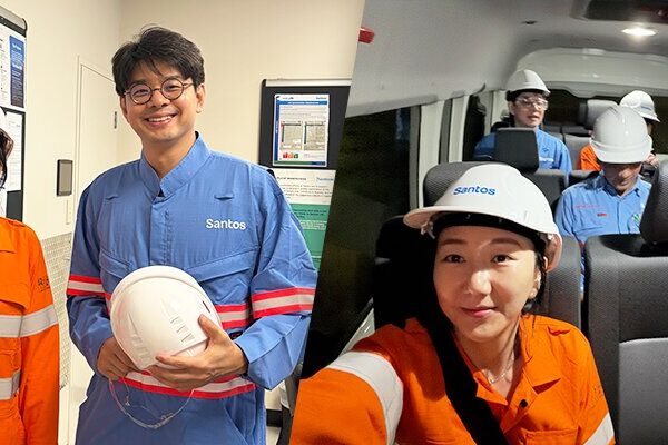 (좌)호주 다윈 LNG 터미널을 방문한 송 특파원과 SK이노베이션 호주LNG사업팀 정성원 매니저, (우)바로사 가스전에서 생산한 LNG 선적 현장을 확인을 위해 호주 LNG 터미널로 떠나는 모습