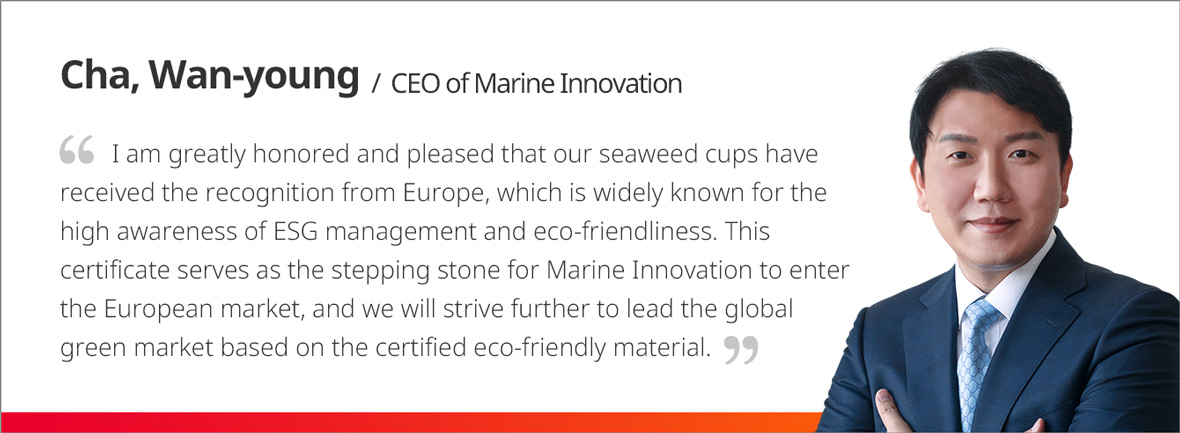 By now, Marine Innovation holds 5 cases of patent registration, 47 cases of the patent application, and 12 cases of Patent Cooperation Treaty (PCT) for its production of pulp mold using various materials such as seaweed and citrus pomade and the coating materials containing a chitosan* coating layer. It has already proved the technological prowess of its green products in the domestic market, and now, it is in the limelight of the international community.