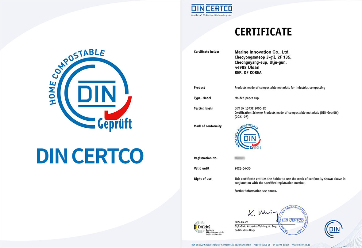 ▲ The certification from DIN CERTO that Marine Innovation received for its Janoodam eco-friendly cups