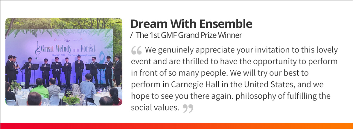 “Dream with Ensemble” and “Vivace Ensemble,” Grand Prize winners of GMF 2017 and 2021, respectively, are the main performers of the event. Great Melody in the Forest is participated by various countries’ ambassadors to South Korea and their family members. This is the second time SK Innovation, Korea JoongAng Daily, and Heat-to-Heart Foundation has invited diplomatic envoys to South Korea for a musical concert with GMF winners, following the Charity Night Gala 2021 in December last year. The Ambassadors Spouses Association in Seoul (ASAS), which is regularly involved in charity programs and donations for the vulnerable social groups, expressed compassion for the event’s tenor and professed to be an eager supporter.