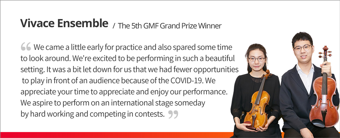 Then “Vivace Ensemble,” a violin and viola duo that won the grand prize at the 5th GMF, then began their performance. “Vivace Ensemble” beautifully played S. Joplin’s “The Entertainer,” Jean Sibelius’ “Duo in C Major,” and other pieces and dominated the stage.