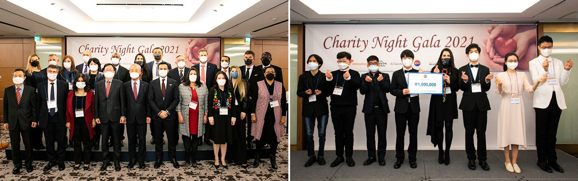 ▲ (Left) SK Innovation held the “Charity Night Gala 2021,” held for people with developmental disabilities, at the Lotte Hotel, Seoul, on December 28, 2021. (Kim Jong-hoon, Chairman of the Board of Directors of SK Innovation (fifth from front left), Cheong Chul-gun, CEO of the Korea JoongAng Daily (fourth from front left), Oh Jee-chul (President of Heart to Heart Foundation), and ambassadors and spouses) / (Right) the developmentally-disabled musicians who received the funds and Konul Teymurova, Interim representative of ASAS (the fourth from the right) are taking photos.), are taking a commemorative photograph