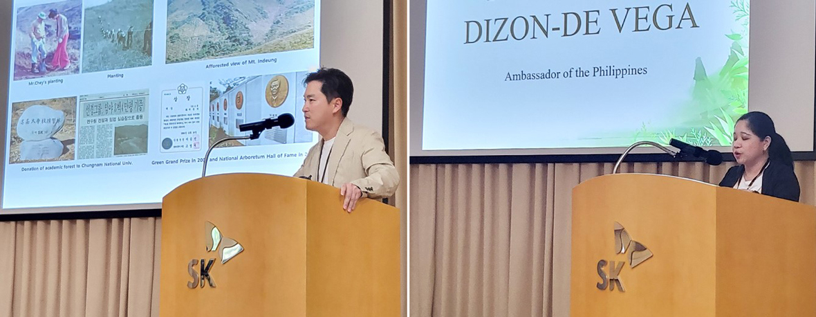 ▲ SK Forest CEO Chung In-bo (left) and Maria Theresa Filipino Ambassador to Korea, give welcome speech to the audience at the Great Melody in the Forest event on May 20, 2022.