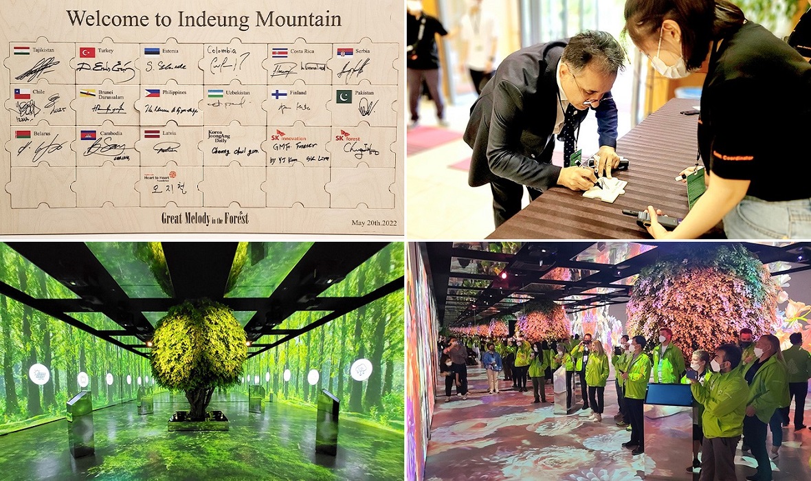 ▲ (Upper left) A puzzle board made of birch trees that have the signatures of the guests who attended the Great Melody in the Forest event. / (Upper right) An Ambassador to South Korea who participated in the Great Melody in the Forest event gives his signature on the board. / (Bottom) Participants of the “Great Melody in the Forest” event look around the special memorial hall at the SK SUPEX Center in Indeung Mountain