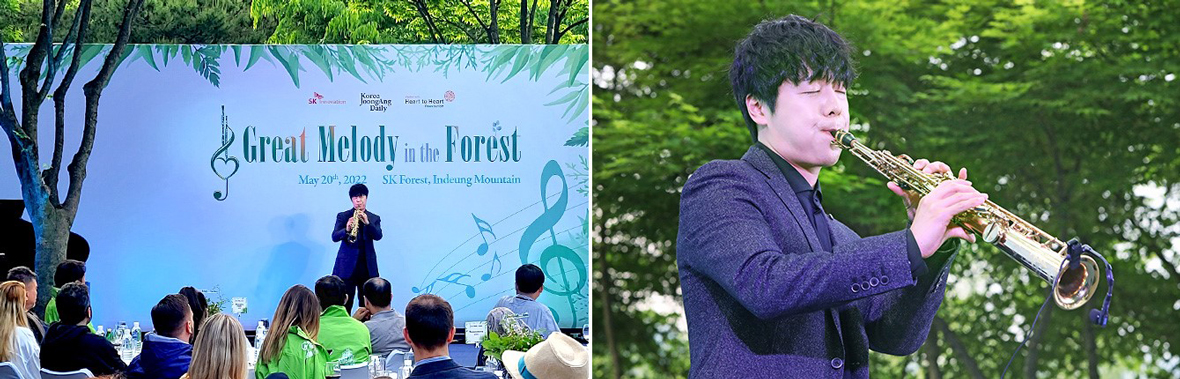 ▲ Mellow Kitchen, a jazz-pop saxophonist, performs at the “Great Melody in the Forest” event on May 20, 2022, at the SK SUPEX Center in Indeung Mountain.