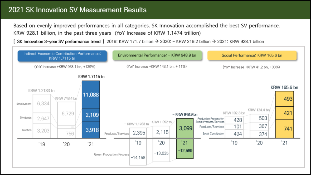 In terms of SK Innovation’s social value performance from last year by each domain, “Indirect Economic Contribution Performance” was KRW 1.7115 trillion, which is a YoY 129% increase (KRW 963.1 billion in 2020), “Environmental Performance” was △ KRW 948.9 billion, which is a YoY 11% increase (KRW 143.1 billion in 2020), and “Social Contribution” was KRW 165.6 billion, which is a YoY 33% increase (KRW 41.2 billion in 2020). Hence, they achieved improved performance compared to the last year across all domains.