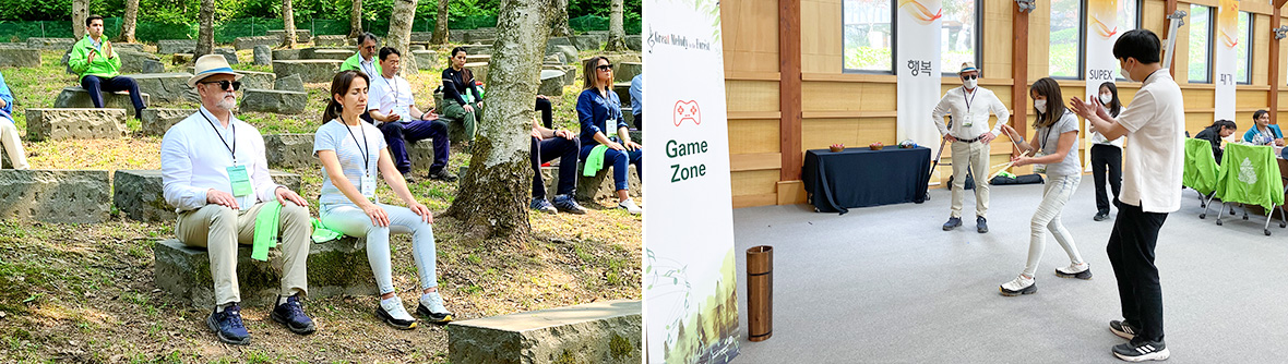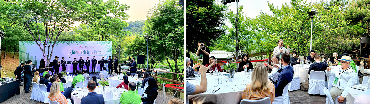 ▲ (A la Izquierda) El primer equipo ganador del GMF “Dream With Ensemble” actua en el evento “Great Melody in the Forest” el 20 de mayo de 2022. / (A la derecha) Embajador de Costa Rica en Corea, Alejandro RODRÍGUEZ ZAMORA (primero de la derecha), disfrutando del evento antes de la interpretación musical.