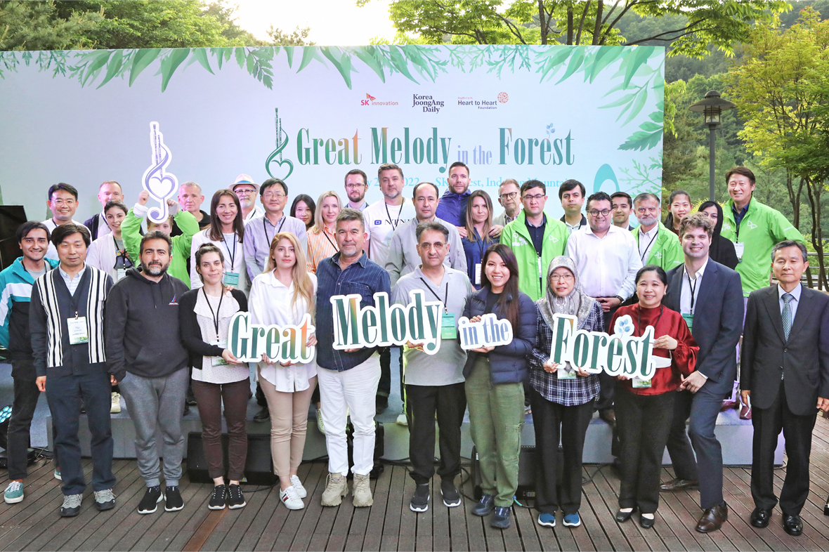 ▲ Varios embajadores en Corea del Sur y sus familiares, junto con representantes de SK Innovation, SK Forest, Korea JoongAng Daily, la Fundación Heart-to-Heart toman una foto de grupo en el evento Great Melody in the Forest que se celebró en el SK SUPEX Center, en la montaña Indeung, Chungbuk, Corea del Sur el 20 de mayo de 2022.