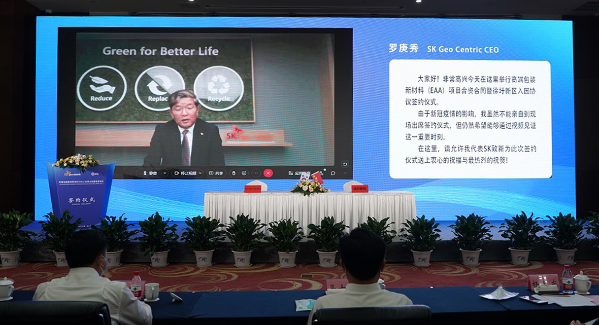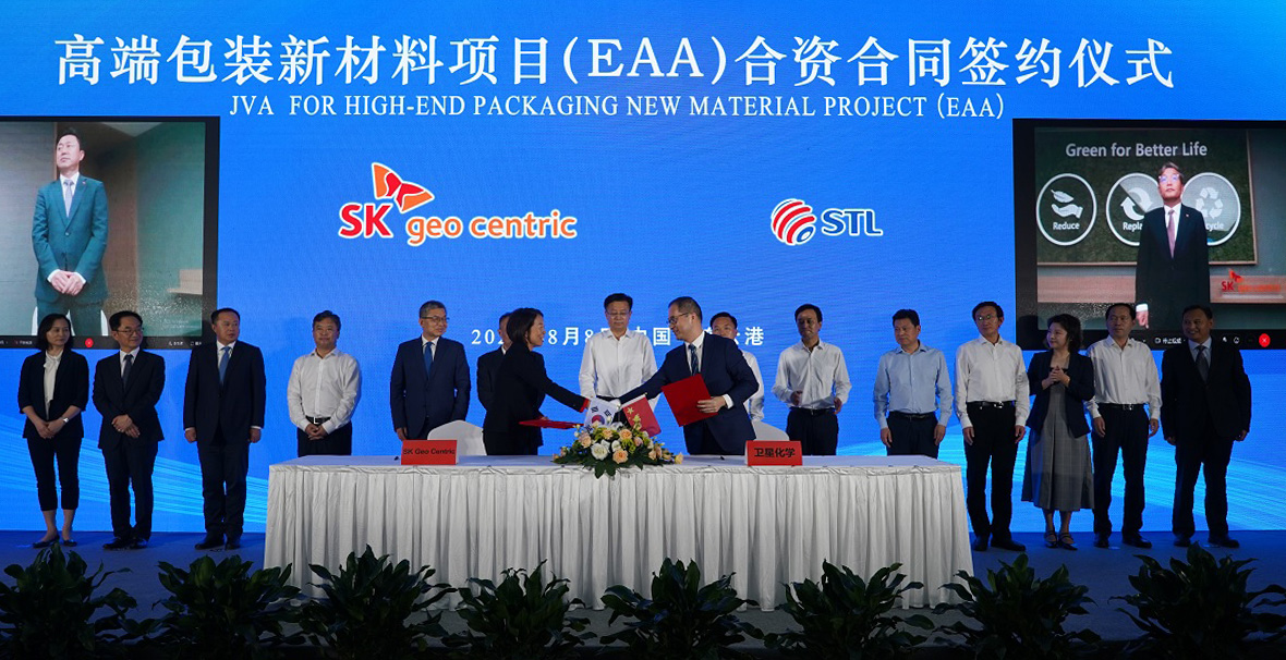 SK Geo Centric announced on the 8th that it had signed the contract to establish a joint venture for EAA production with Zhejiang Satellite Petrochemical in China, and also signed an investment agreement with the Lianyungang Petrochemical Complex in Xuwei. SK Geo Centric and Zhejiang Satellite Petrochemical established a joint venture in a share ratio of 6:4, and will build an EAA manufacturing plant by investing approximately KRW 290 billion on a site of roughly 66,000 m2 (20,000 pyeong) in the petrochemical complex located in Lianyungang, Jiangsu Province, in China. The plant is scheduled to be completed in the first half of 2025 to start commercial production with an annual capacity of 40,000 tons. The EAA to be produced by the joint venture is the perfect combination of SK’s processing technology, factory operation know-hows, and raw materials from Zhejiang Satellite Petrochemical.