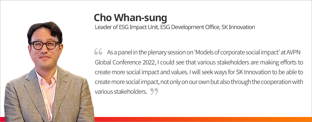 ▲ Cho Whan-sung, Leader of ESG Impact Unit, ESG Development Office, SK Innovation, speaks at the Models of Corporate Social Impact: Being Intentional and Strategic plenary session, a part of AVPN Global Conference 2022