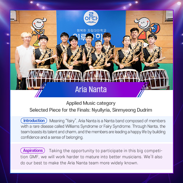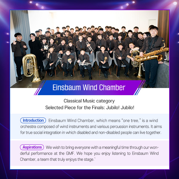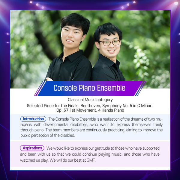 The 6 finalist teams will be provided with not only a chance to perform, but also a total of KRW 21 million cash prize, more specifically ▲ KRW 10 million prize money for the first prize winner, ▲ KRW 5 million prize money for the second prize winner, ▲ KRW 2 million prize money for two third prize winners, respectively and ▲ KRW 1 million prize money for two fourth prize winners, respectively. In particular, the winning team of the grand prize will receive the Korean Ministerial Prize of Culture, Sports and Tourism, for the purpose of revitalizing performance teams of musicians with developmental delayed.