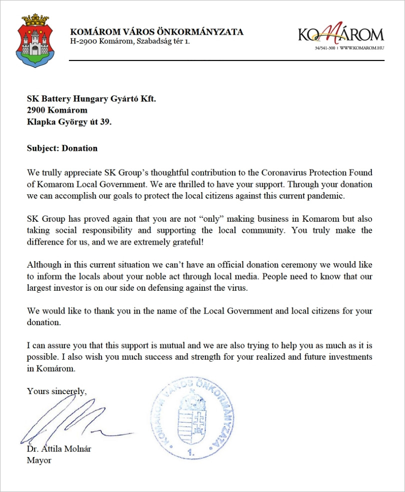 Due to the situation of COVID-19, the donation ceremony was not held. However, Dr. Attila Molnár, Mayor of Komárom sent a letter of appreciation to SK Innovation, and shared his thoughts through an interview in written format with SKinno News.