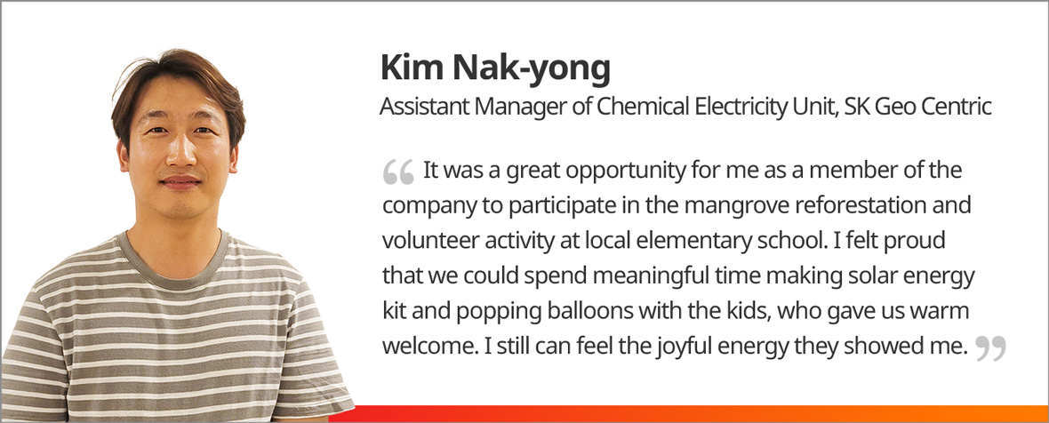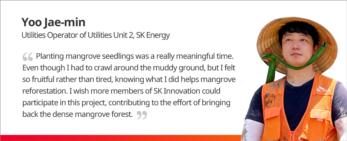 Park Sung-kil, Head of the Crude Oil and Petroleum Offsite Office, SK Energy, and the leader of the Ulsan CLX volunteer group, said, “Not only Ulsan CLX but all members of SK Innovation’s affiliates are making a lot of efforts to reduce carbon, so it was such a meaningful day for me and the Ulsan CLX members to be able to directly participate in the mangrove reforestation activity, a practical program that embodies the ESG management of our company.” “I hope that SK Innovation’s social contribution and carbon reduction activities will keep expanding and being active.”