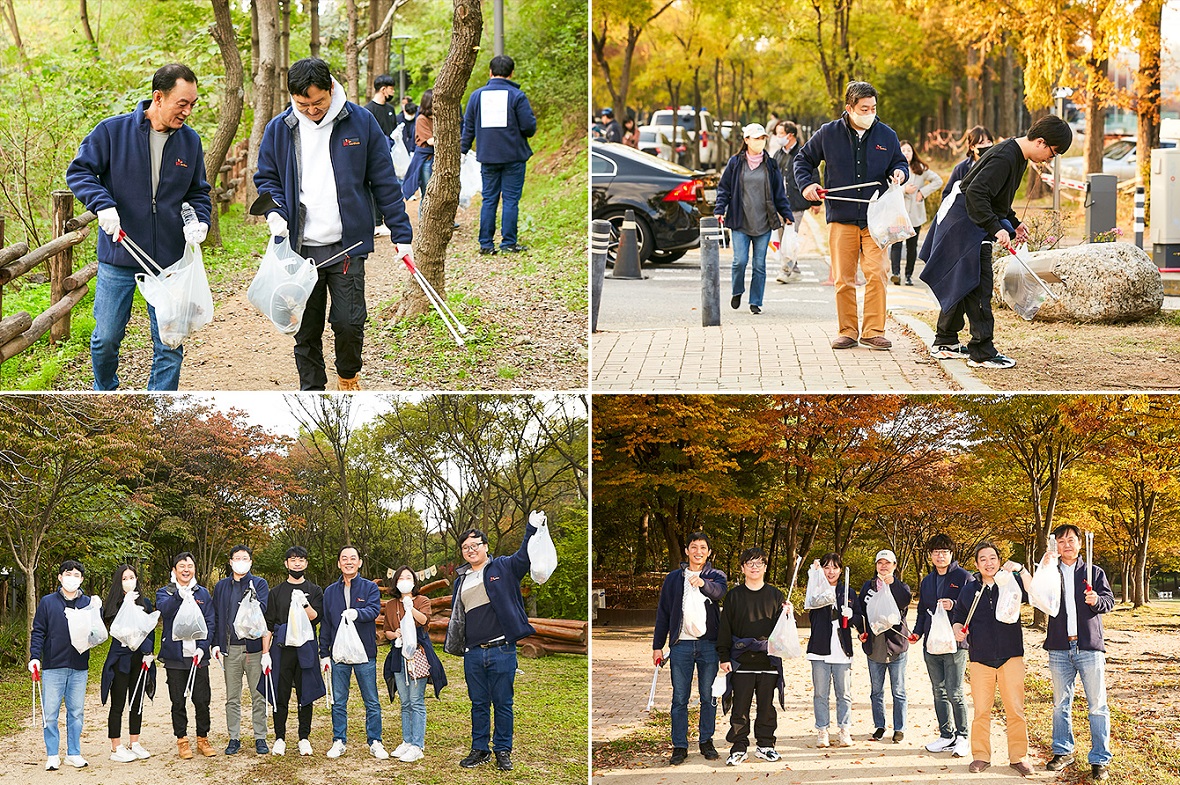 ▲ SK Earthon CEO Myeong Seong (first from left on the upper left photo, first from right on the upper right photo) and members collect trash during the EnviRun activity on October 21.