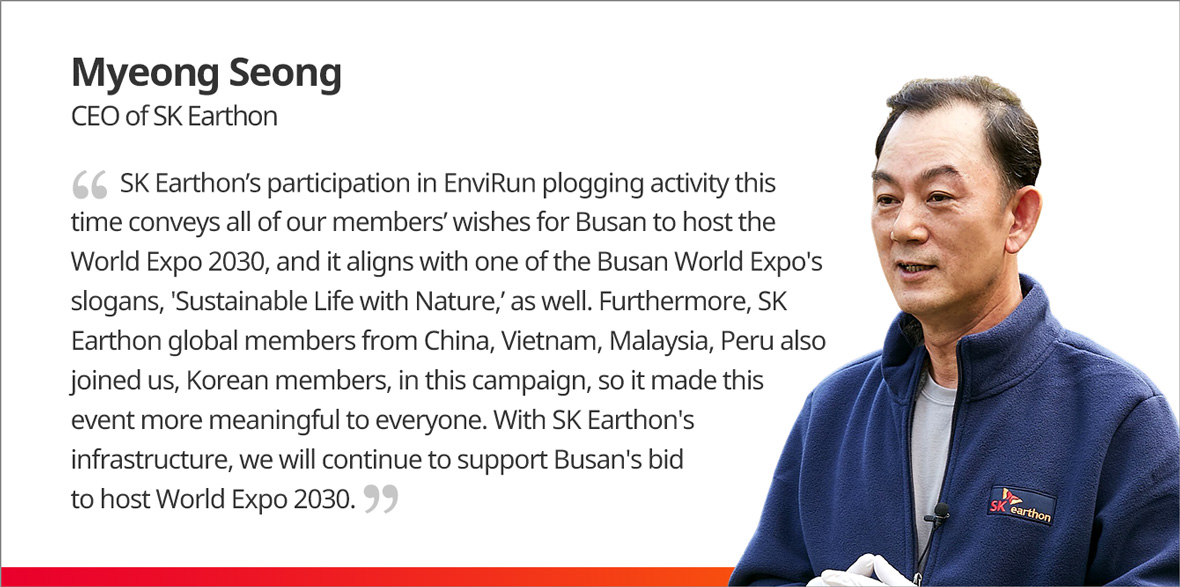 On October 21, SK Earthon CEO Myeong Seong and about 60 members of the company participated in the EnviRun campaign at the Seoul World Cup Stadium, where the 2002 Korea-Japan World Cup was held. All participants of the event on that day wear the company’s jackets that have stickers saying “Supporting for Busan’s bid to host World Expo 2030.”