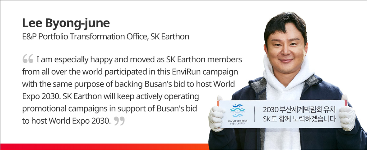 The EnviRun campaign by SK Earthon reflects its corporate name, which is a coined word combining ‘earth’ for ‘the globe’ or ‘terrain’, and ‘on’ for ‘continuation,’ proving how the company is “Realizing the value of resources based on technical prowess and expertise, and turning on the hope of green business that promises a sustainable future.” Moreover, it is extra meaningful that the campaign was being carried out not only by Korean members, but also by those from other countries, who are united in hope for Busan to host World Expo 2030.