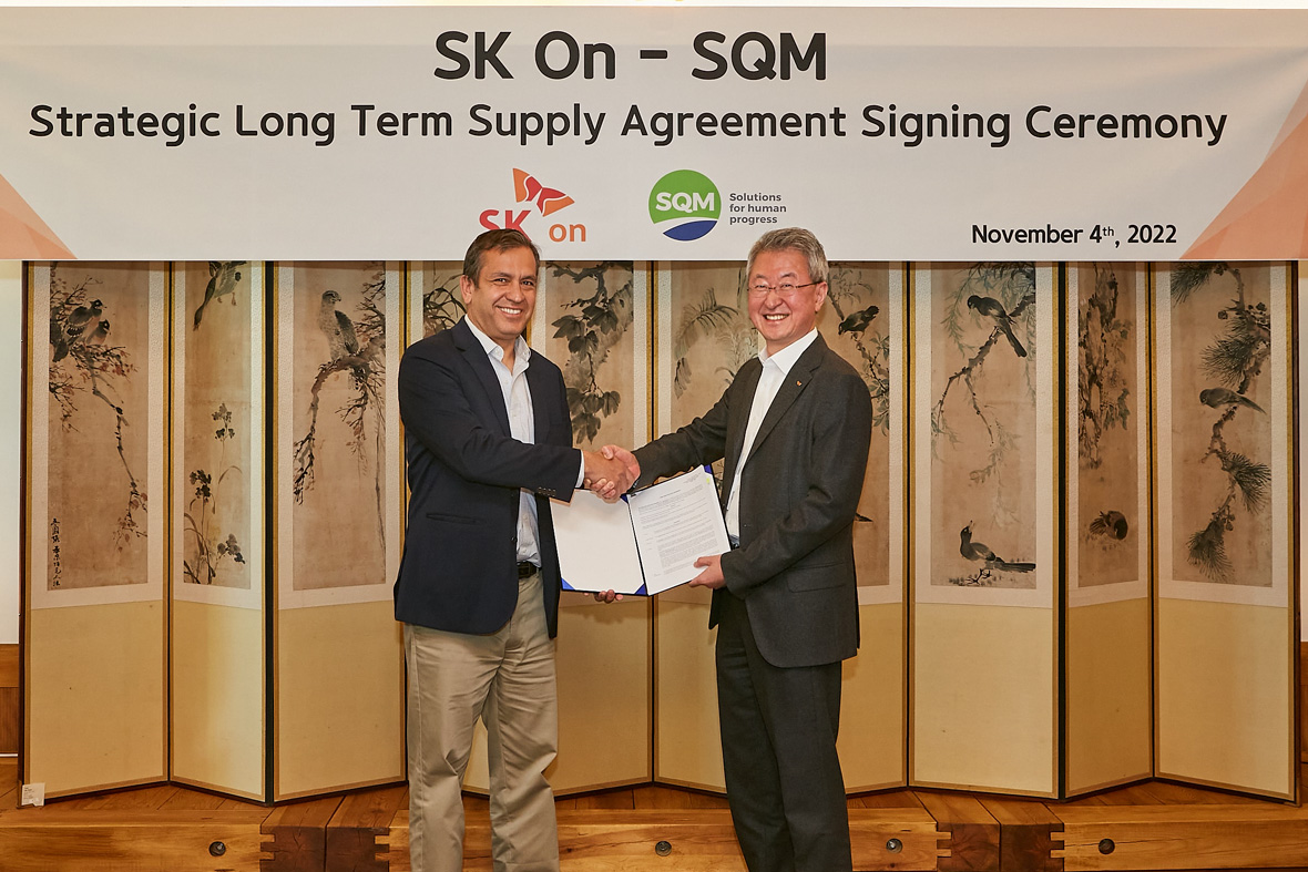 Attended by Jin Kyo-won, Chief Operating Officer at SK On, and Carlos Díaz, Executive Vice President Lithium at SQM, the two companies held a signing ceremony for the lithium deal on November 4 at SK Group’s headquarter Seorin building in Seoul, South Korea.
