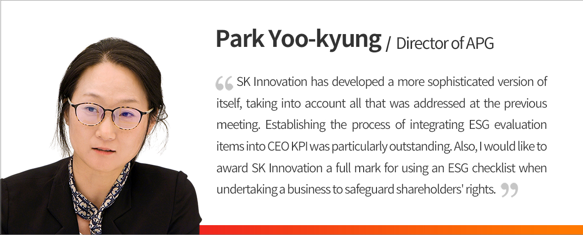 Park Yoo-kyung, Director of APG Asset Management, who attended this year’s meeting following last year, looked over SK Innovation’s ESG management status and results and expressed her support for SK Innovation, which is wholeheartedly strengthening its ESG management system.