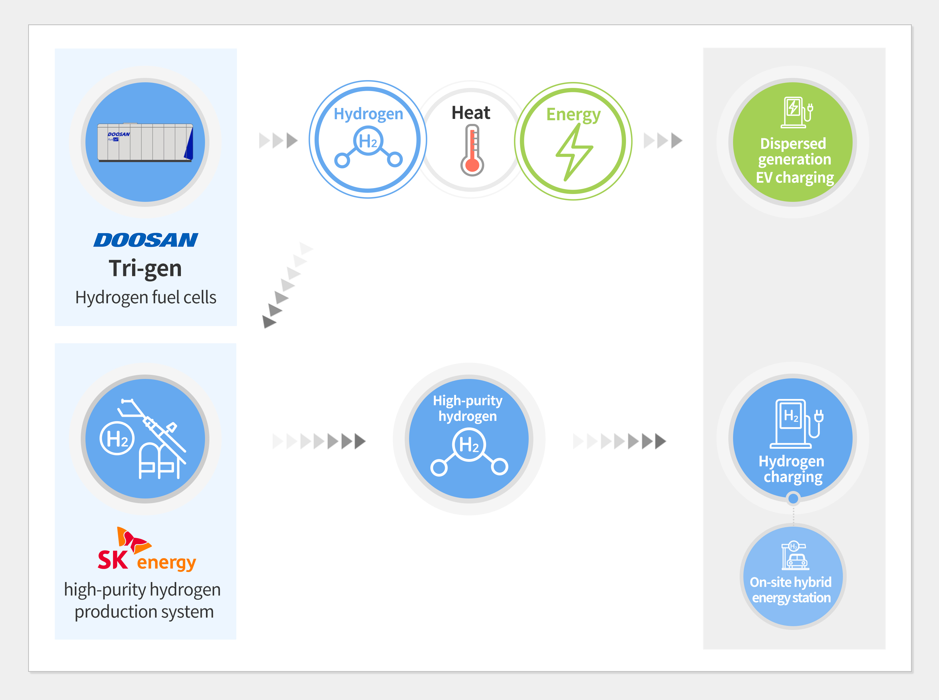 ■ On-site hybrid energy stations will be built using SK’s high-purity hydrogen production system and Doosan’s Tri-gen fuel cells