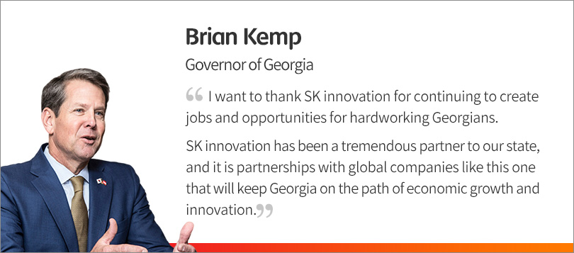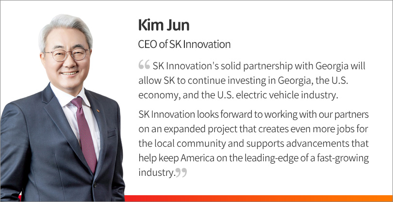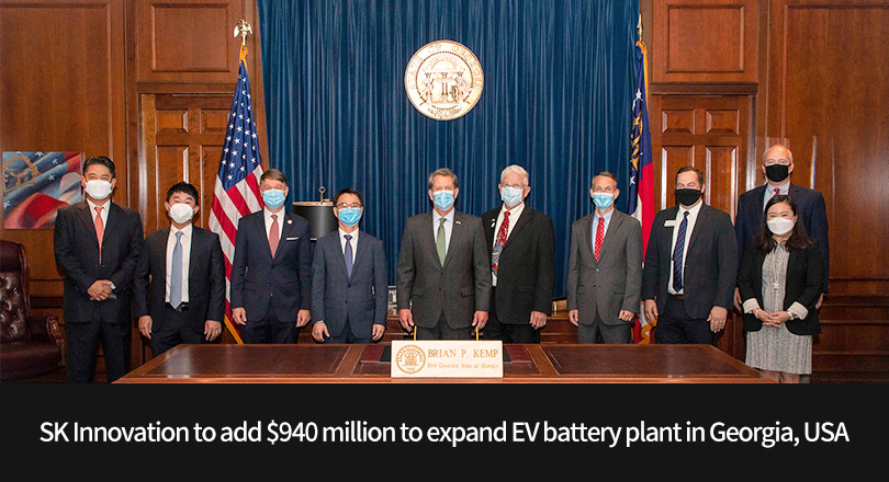 SK Innovation has signed to add another 940 million USD investment to expand the EV battery manufacturing plant located in Commerce, Georgia, USA. Governor of Georgia Brian P. Kemp, Georgia Department of Economic Development (GDEcD) Commissioner Pat Wilson, Chairman of the Jackson County Board of Commissioners Tom Crow, President of SK Battery America Junho Hwang came together for the signing ceremony took place at the office of the Governor of Georgia state on June 25th (local time).