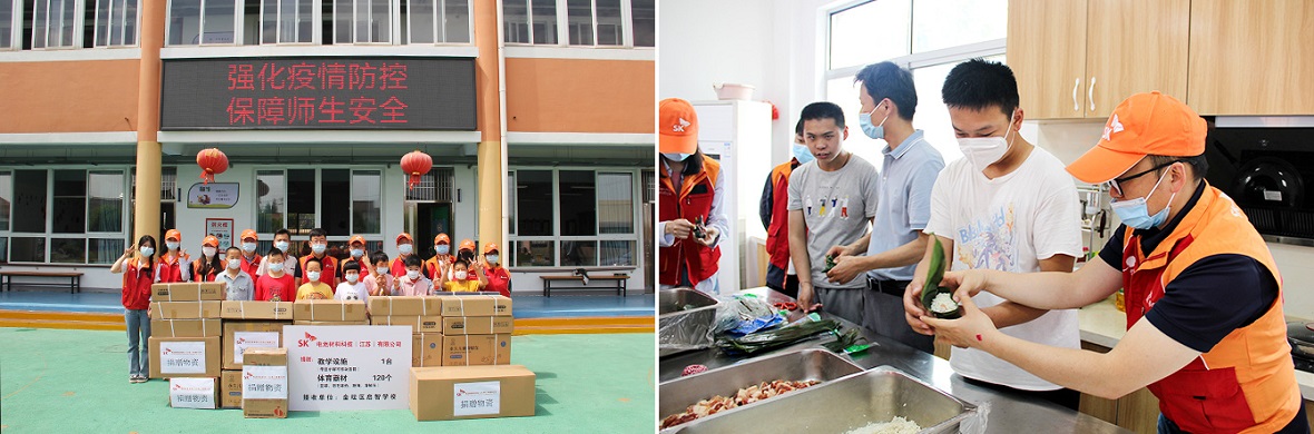 ▲ 今年5月,SKBMC成员前往公司附近的特殊学校“金坛区启智学校”捐赠了教学设施与物品后,与学生们拍摄纪念照。