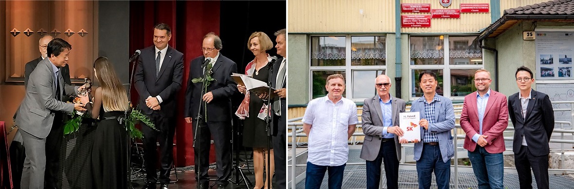 ▲ (左)2021年9月,在波兰西里西亚省栋布罗瓦古尔尼恰市举办的“米哈乌斯皮萨克国际音乐节(Michał Spisak International Festival)”上,SK ie technology波兰法人代表朴昞喆(左一)正在为获得单簧管演奏第一名的获奖者阿加塔·皮翁泰克(Agata Piątek,左二)颁奖。(右)与CKZiU技术学校签订产学合作协议后,与会者拍照留念。(左起:索斯诺维茨副市长Zbigniew Byszewski、CKZiU技术学校校长Jacek Górski、SKBMP法人代表朴昞喆、卡托维兹经济特区副代表Mateusz Rykała)