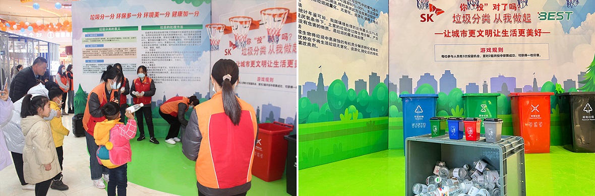 ▲ (左)今年1月,SKBMC和BEST员工在和现场参与者一起玩分类回收游戏。(右)SKBMC和BEST设在江苏省常州市金坛区最大购物商场吾悦广场内的ESG活动角。