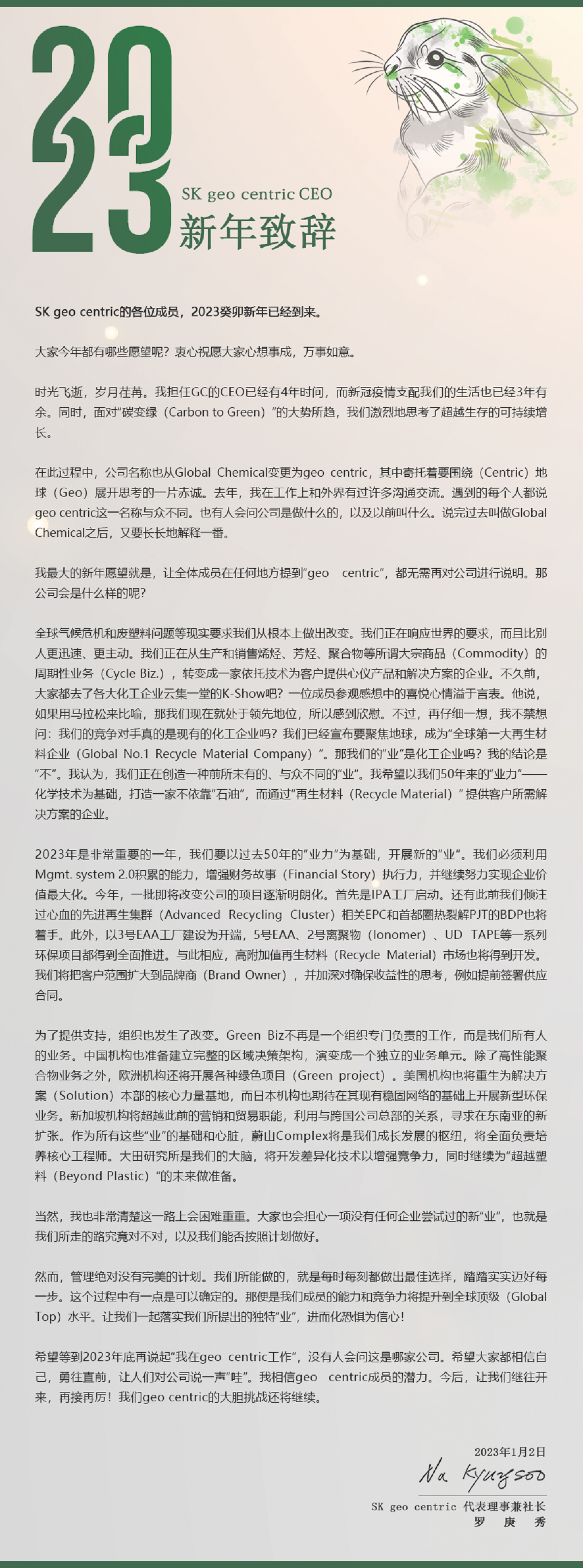 2023 SK Geo Centric CEO 新年致辞 2023. 01. 02 SKInnovation 2023 SK Geo Centric CEO 新年致辞 AI Summary AI Voice Media Kit Previous Post Next Post Related Articles INNO FOCUS [Inno Time] Georgia & Detroit: Bringing K-Battery Power to North America 2026.02.02 PRESS SK Innovation, SK On Partner with Standard Energy on Safer ESS 2026.01.06 CORPORATES PRESS CENTER SK Innovation Ulsan CLX to be the first in Korea to apply eco-friendly pyrolysis oil in refinery&petrochemical process 2021.09.30 CORPORATES INSIGHT SK Innovation’s endeavor to achieve Decarbonization by taking Green Transformation ② SK Innovation & SK Energy take the initiative in accomplishing Net Zero with CCS technology 2021.09.20