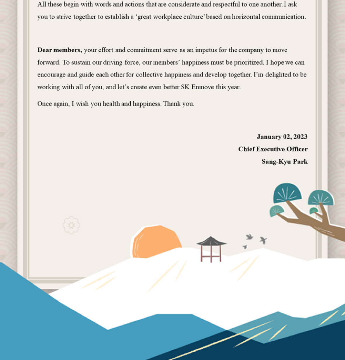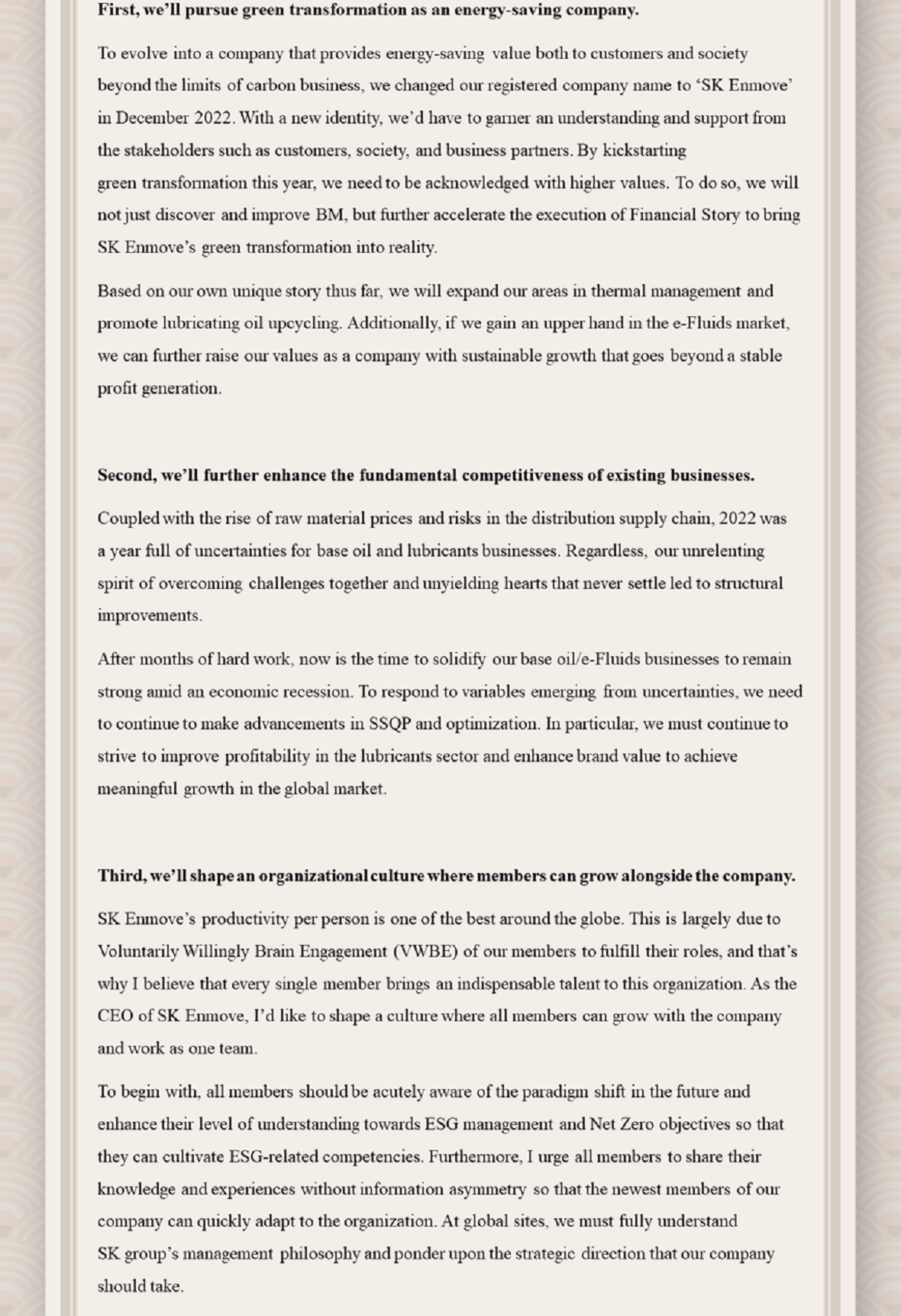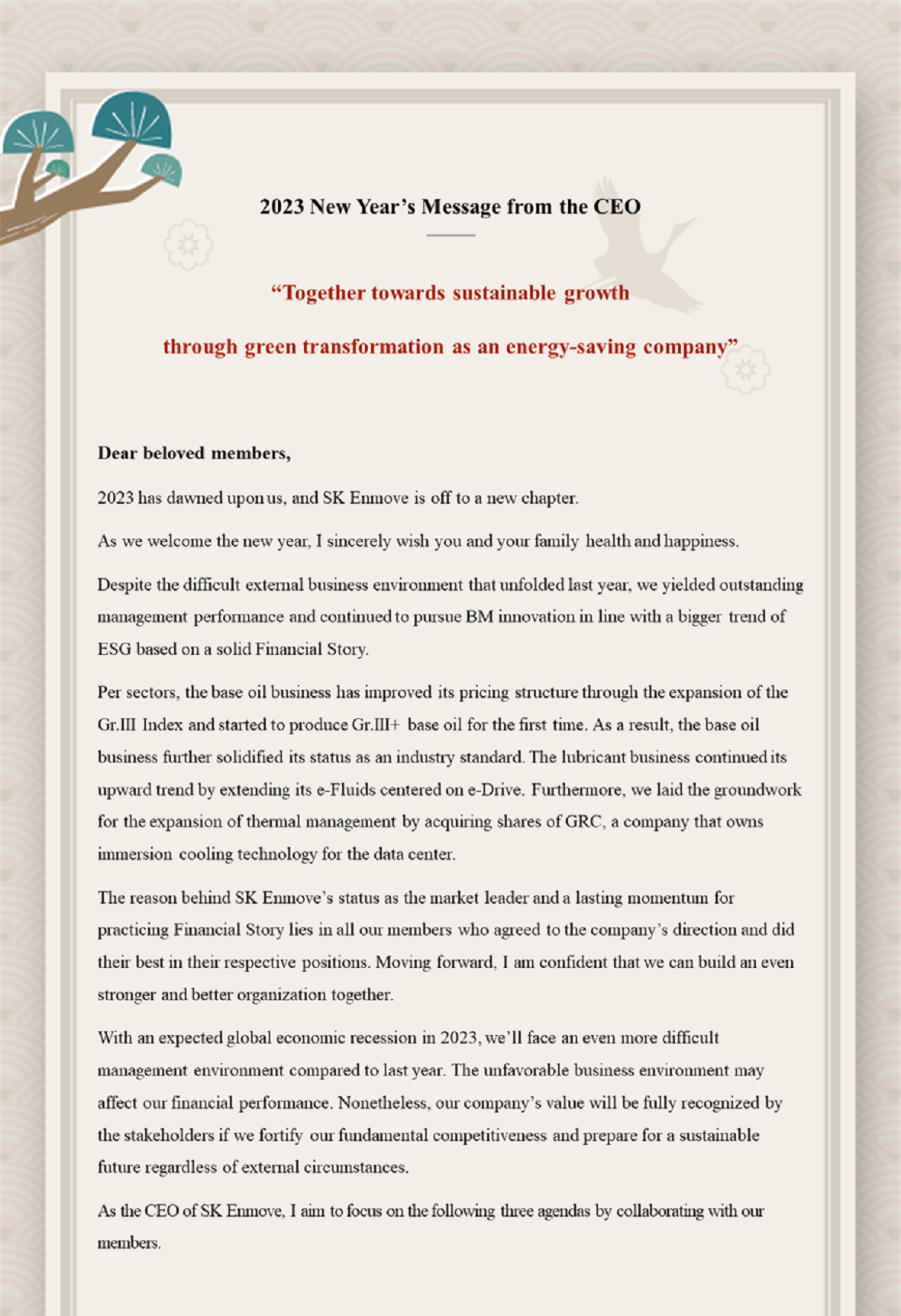 2023 SK Enmove New Year’s Greetings 2023. 01. 02 SKInnovation 2023 SK Enmove New Year’s Greetings AI Summary AI Voice Media Kit Previous Post Next Post Related Articles PRESS SK Innovation, SK On Partner with Standard Energy on Safer ESS 2026.01.06 PRESS SK Enmove Forms Strategic Alliance for Immersion Cooling in AI Data Centers, Targeting Global Market Expansion 2025.10.28 CORPORATES PRESS CENTER SK Innovation Ulsan CLX to be the first in Korea to apply eco-friendly pyrolysis oil in refinery&petrochemical process 2021.09.30 CORPORATES INSIGHT SK Innovation’s endeavor to achieve Decarbonization by taking Green Transformation ② SK Innovation & SK Energy take the initiative in accomplishing Net Zero with CCS technology 2021.09.20