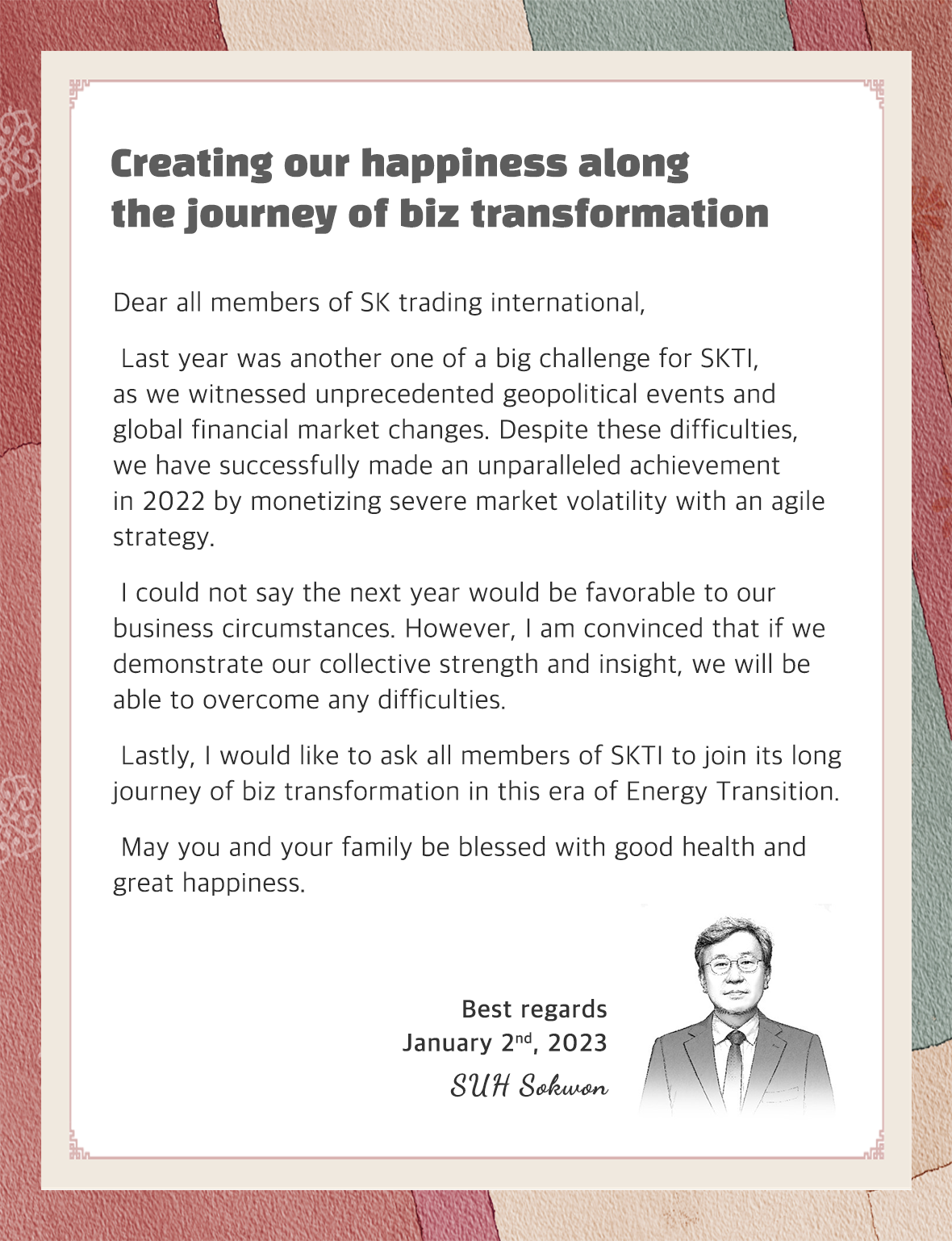 2023 SK Trading International CEO New Year’s Greetings 2023. 01. 02 SKInnovation 2023 SK Trading International CEO New Year’s Greetings AI Summary AI Voice Media Kit Previous Post Next Post Related Articles INNO FOCUS [Inno Time] Georgia & Detroit: Bringing K-Battery Power to North America 2026.02.02 PRESS SK Innovation, SK On Partner with Standard Energy on Safer ESS 2026.01.06 CORPORATES PRESS CENTER SK Innovation Ulsan CLX to be the first in Korea to apply eco-friendly pyrolysis oil in refinery&petrochemical process 2021.09.30 CORPORATES INSIGHT SK Innovation’s endeavor to achieve Decarbonization by taking Green Transformation ② SK Innovation & SK Energy take the initiative in accomplishing Net Zero with CCS technology 2021.09.20