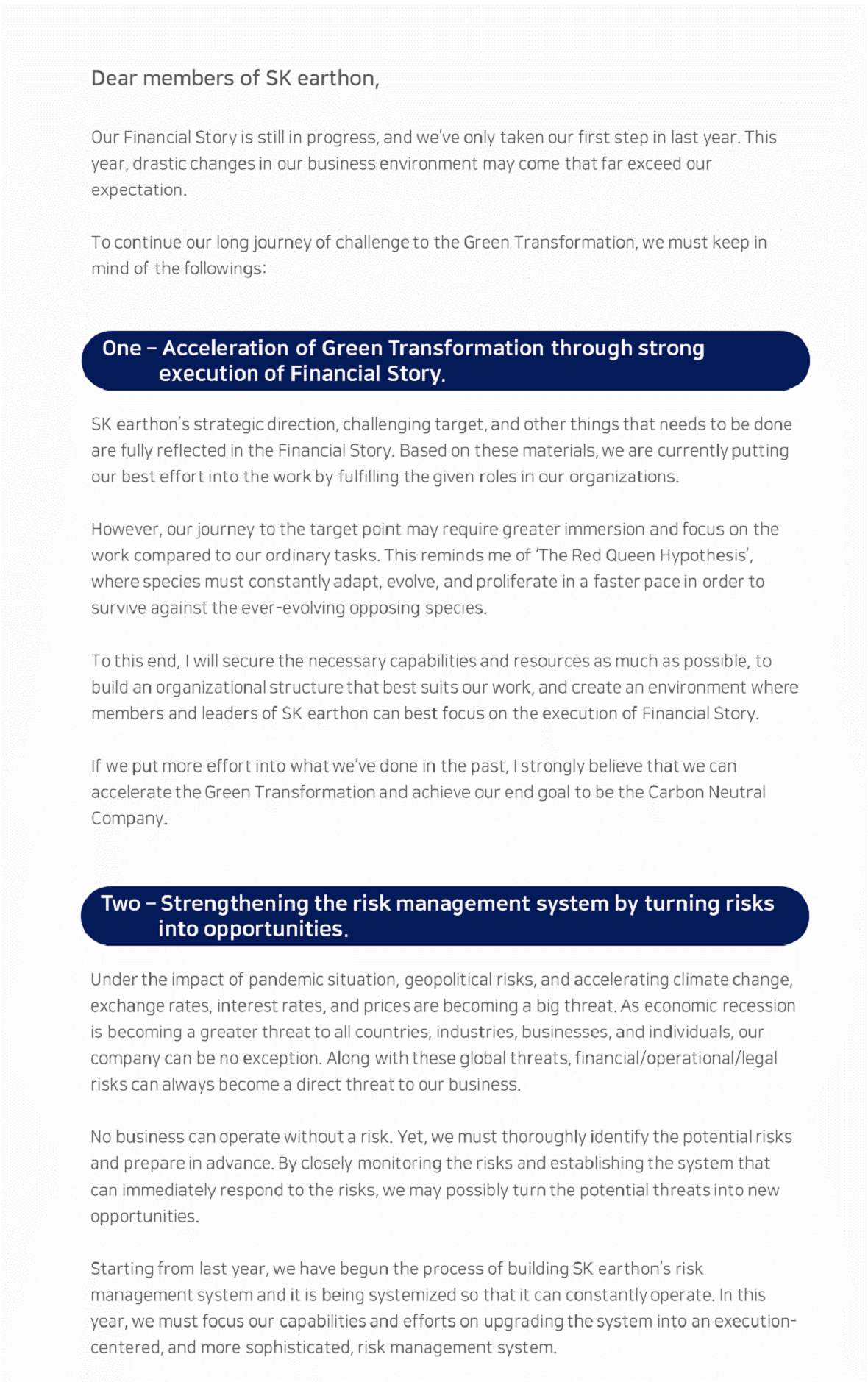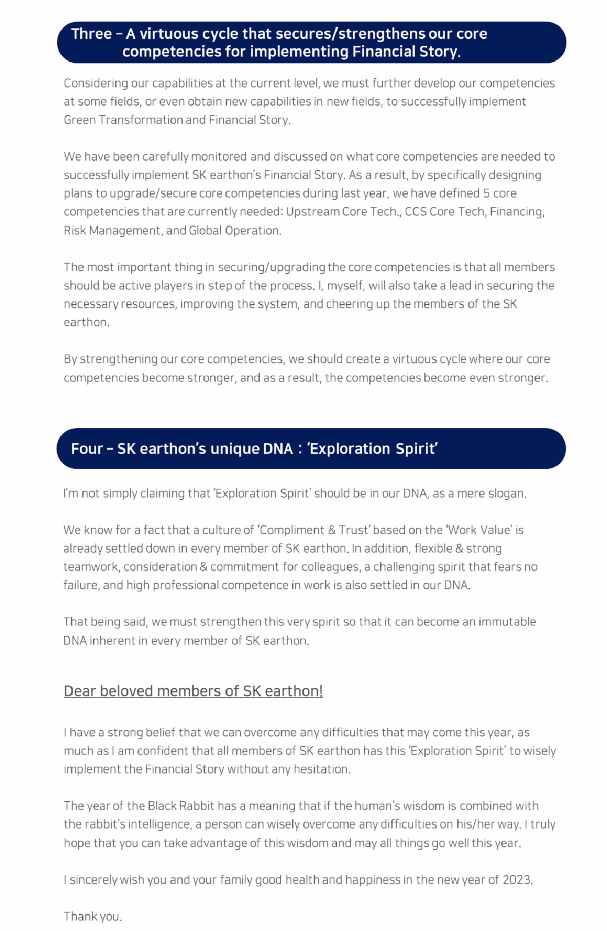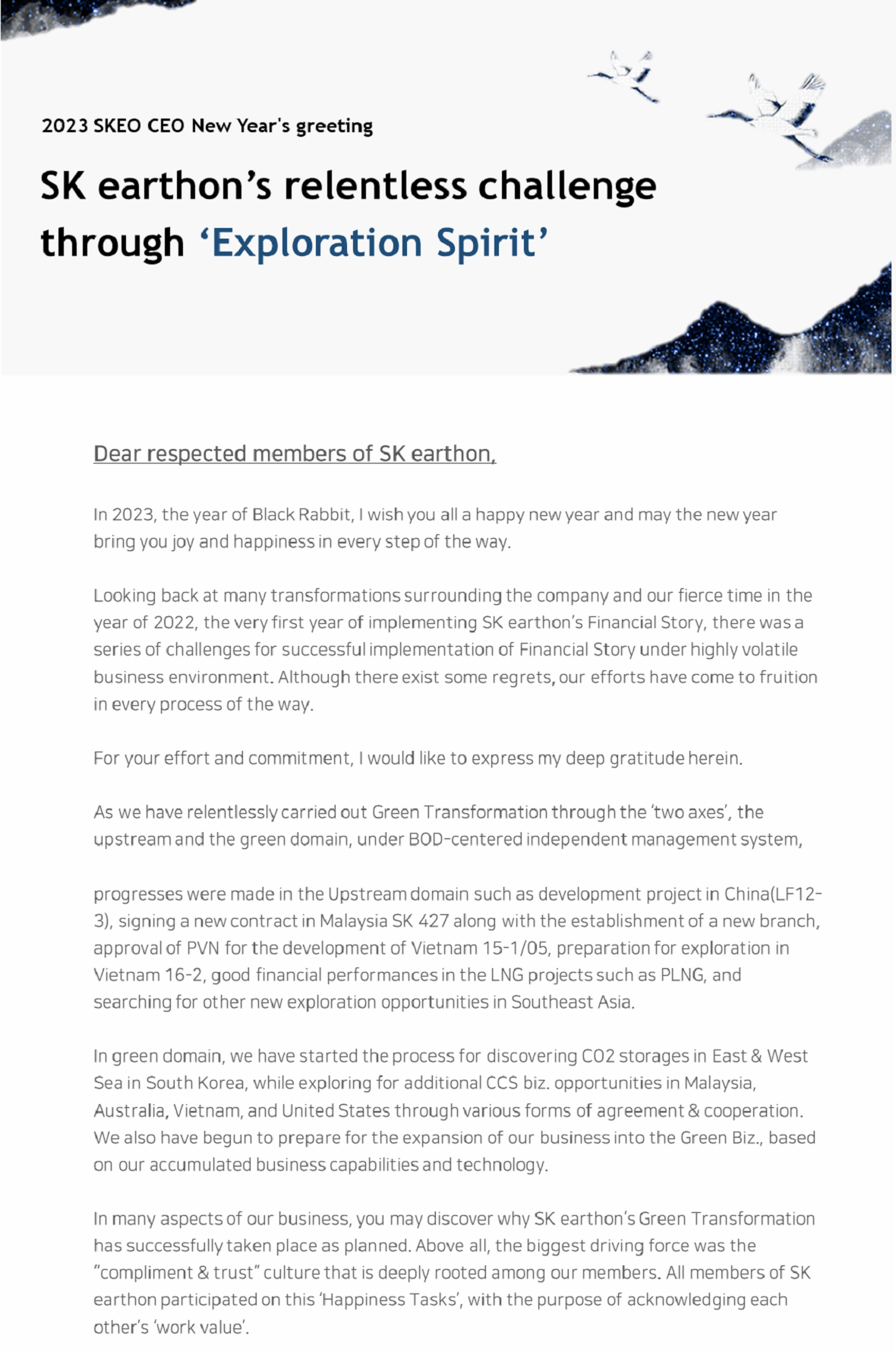 2023 SK Earthon CEO New Year’s Greetings 2023. 01. 02 SKInnovation 2023 SK Earthon CEO New Year’s Greetings AI Summary AI Voice Media Kit Previous Post Next Post Related Articles PRESS SK Innovation, SK On Partner with Standard Energy on Safer ESS 2026.01.06 PRESS SK Earthon Secures Stake in North Ketapang Block in Indonesia 2025.11.24 CORPORATES PRESS CENTER SK Innovation Ulsan CLX to be the first in Korea to apply eco-friendly pyrolysis oil in refinery&petrochemical process 2021.09.30 CORPORATES INSIGHT SK Innovation’s endeavor to achieve Decarbonization by taking Green Transformation ② SK Innovation & SK Energy take the initiative in accomplishing Net Zero with CCS technology 2021.09.20