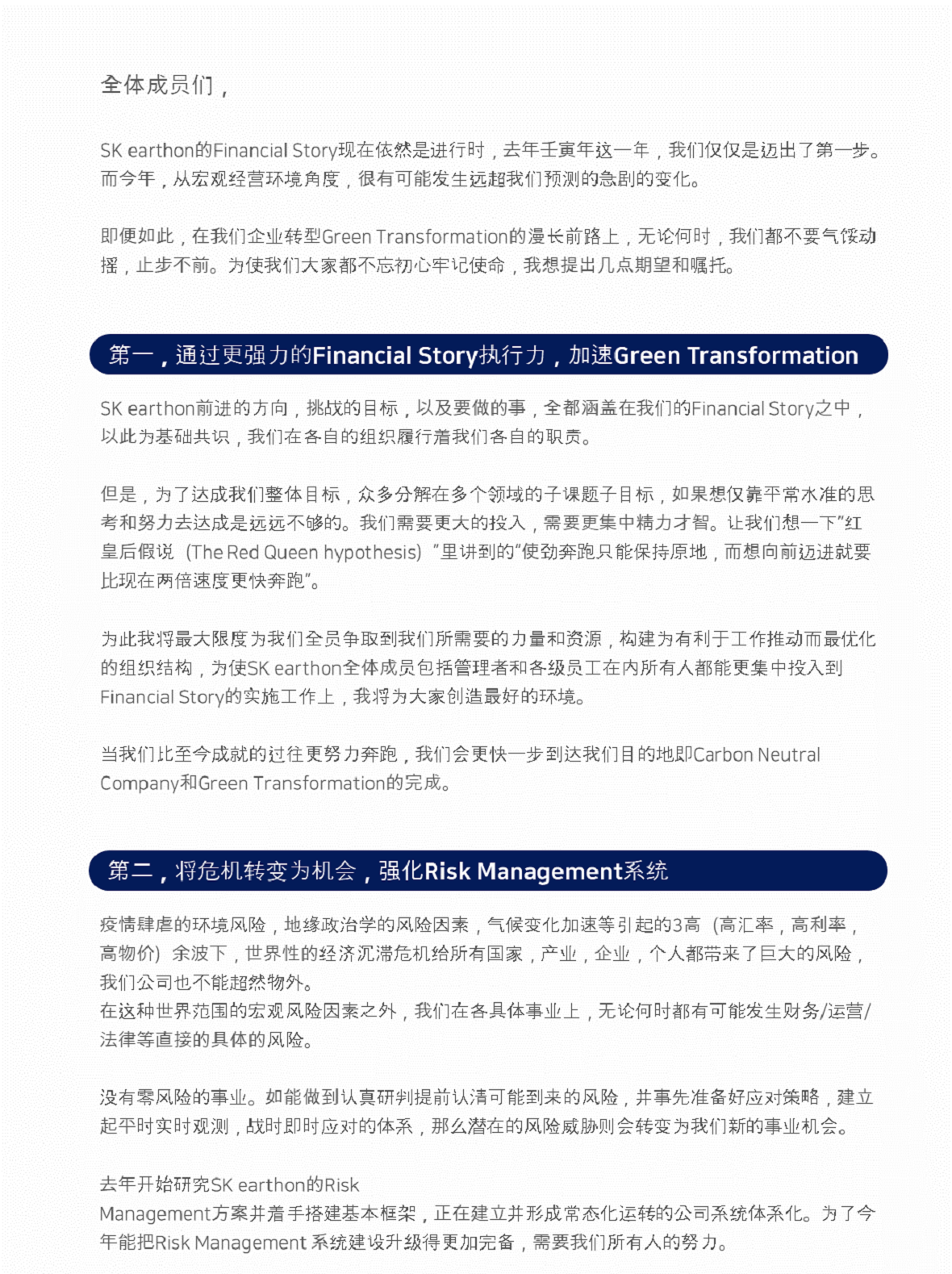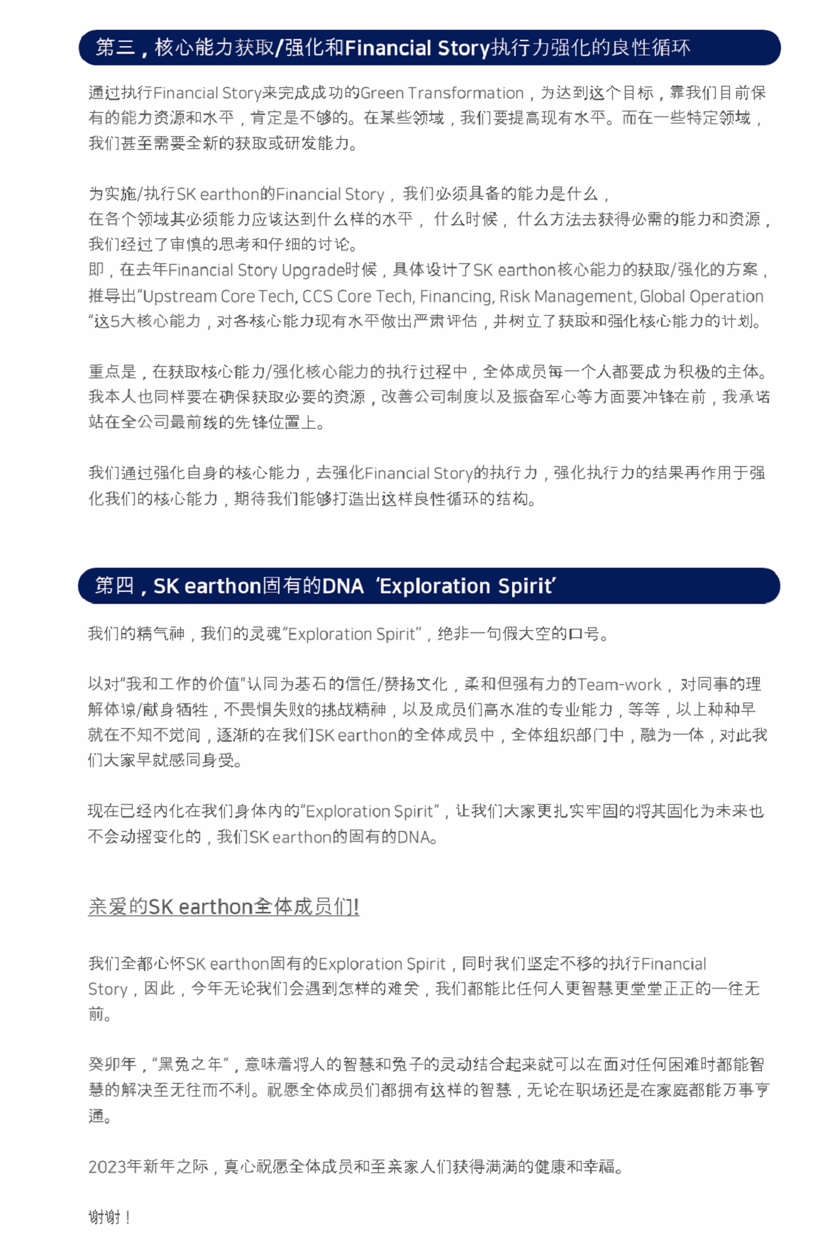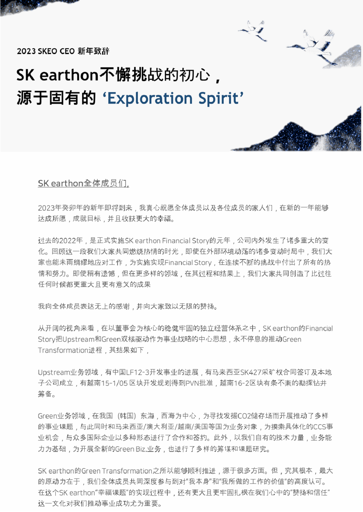 2023 SK Earthon CEO 新年致辞 2023. 01. 02 SKInnovation 2023 SK Earthon CEO 新年致辞 AI Summary AI Voice Media Kit Previous Post Next Post Related Articles PRESS SK Innovation, SK On Partner with Standard Energy on Safer ESS 2026.01.06 PRESS SK Earthon Secures Stake in North Ketapang Block in Indonesia 2025.11.24 CORPORATES PRESS CENTER SK Innovation Ulsan CLX to be the first in Korea to apply eco-friendly pyrolysis oil in refinery&petrochemical process 2021.09.30 CORPORATES INSIGHT SK Innovation’s endeavor to achieve Decarbonization by taking Green Transformation ② SK Innovation & SK Energy take the initiative in accomplishing Net Zero with CCS technology 2021.09.20