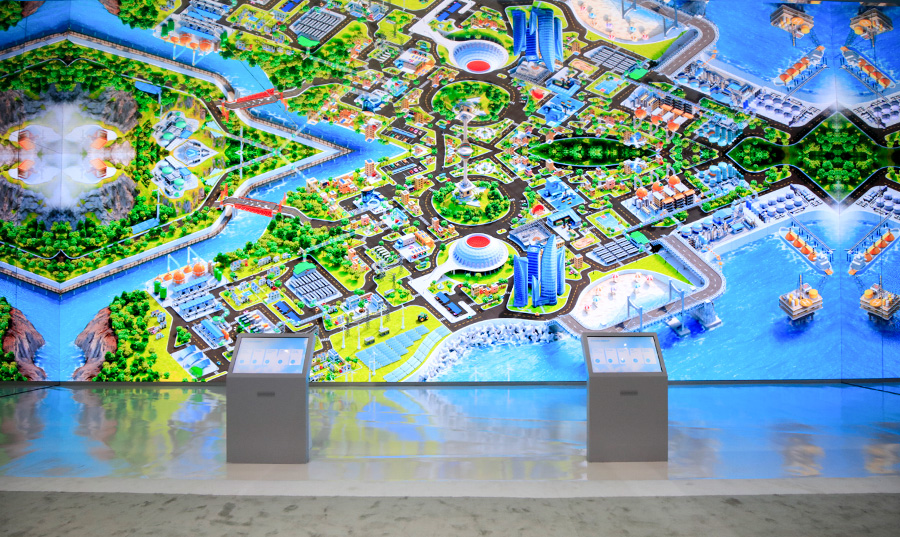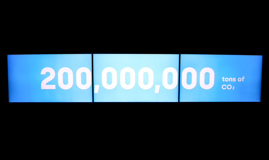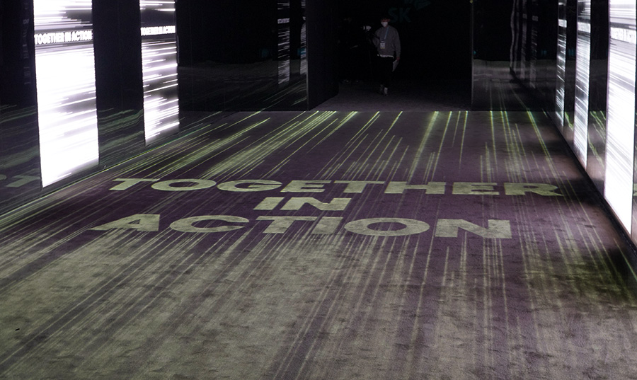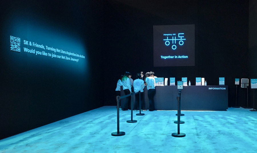 In the space that follows, ocean currents on the floor gradually turn into letters between the disappearing landmarks and the phrase “Together in Action” emerges. It encourages visitors to participate in SK’s actions to prevent climate change and guides them to the exhibition “Together in Action.” In the “Together in Action” Zone, SK’s commitment to reducing 200 million tons of carbon by 2030, or 1% of the global target, is emphasized again. It also asks visitors to join in for the reduction of the remaining 99%.