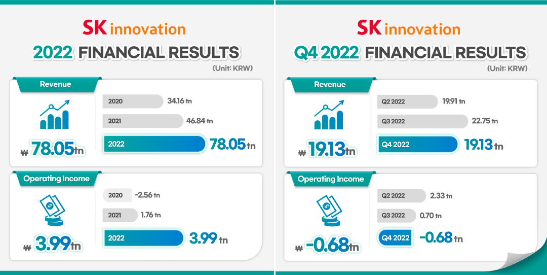 SK Innovation explained, “Although Q4 2022 recorded operating loss caused by the drop in oil prices, an inventory-related loss, and reduced refining margin, the company accomplished its record-high annual operating profit.” “The momentum of high oil prices which continued until the first half of last year improved refining margin in line with increased demand in oil products, and significant increase in export volume of the oil products contributed to the annual performance improvement compared to the previous year.”