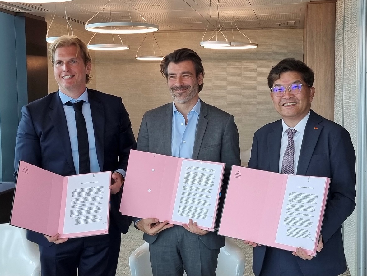 ▲ SK Geo Centric and SUEZ announced their partnership in June 2022 at SUEZ Headquarter in France. (From left) Loop Industries Founder & CEO Daniel Solomita, Vice president of Suez Max Pellegrini, and SK Geo Centric CEO Na Kyung-Soo