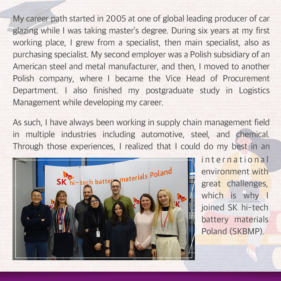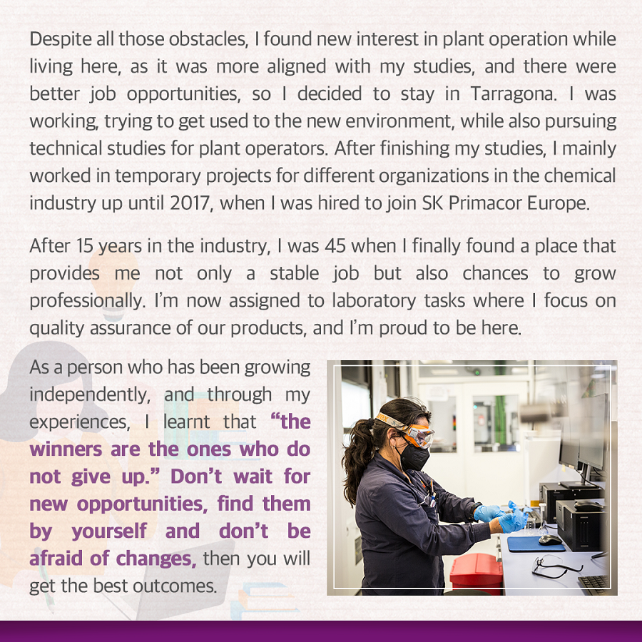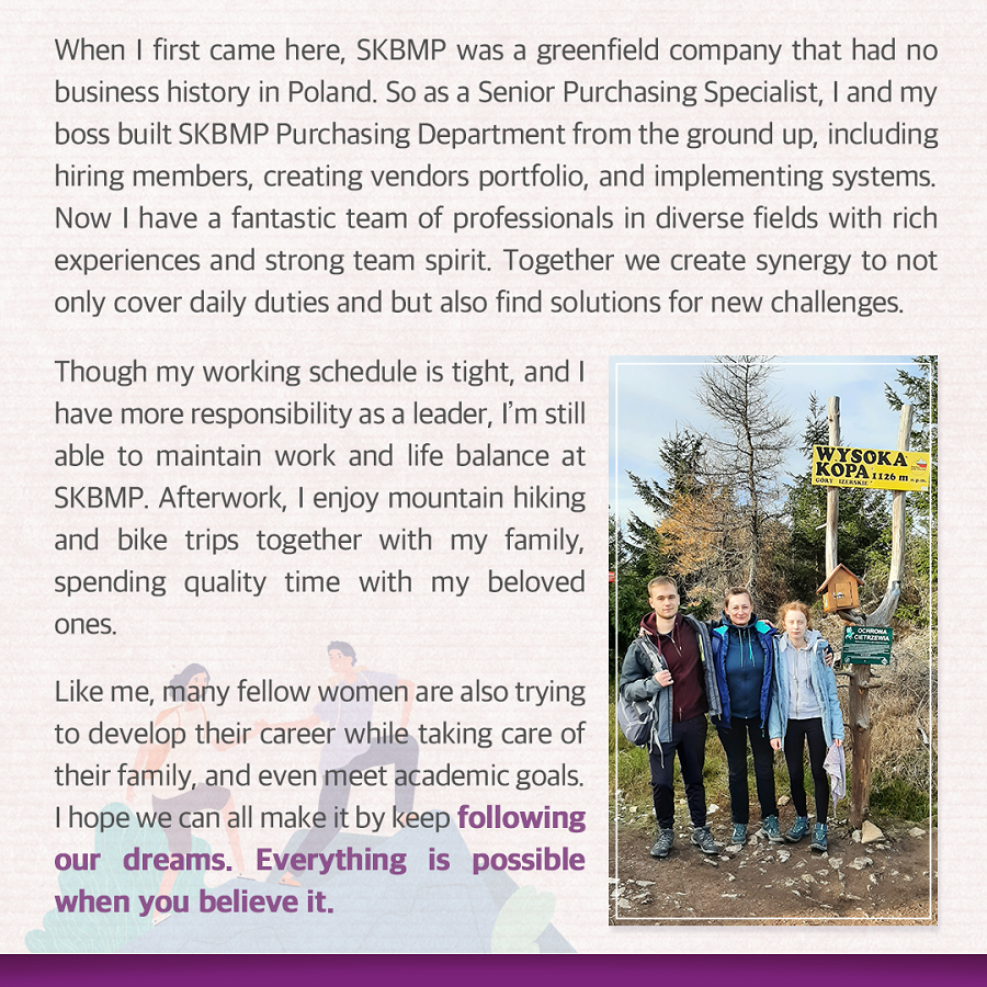 Three female employees working in different business sites of SK Innovation around the globe sent us their stories for the Skinno News readers. Let’s find out how they have been pursuing dreams and check their empowering messages for women.