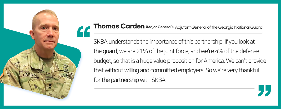 In July 2022, SKBA announced a partnership with the Georgia National Guard’s “Work for Warriors Georgia” program to focus on hiring veterans, servicemembers, retirees, reservists and their families. This program is a premier response to the growing problem of unemployment and underemployment of currently serving Guardsmen and women, and the broader military. It focuses on bridging the gap between service and civilian employment as there is a direct correlation between wellness and readiness of the servicemember and a healthy working environment and relationship with their civilian employer when they are not in uniform.
