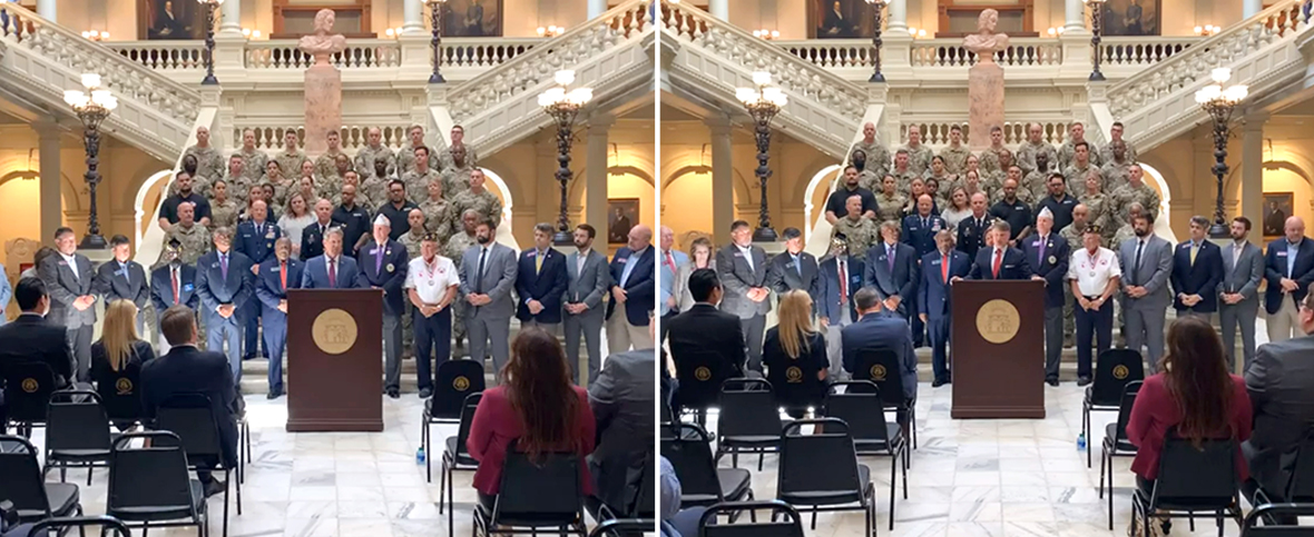 ▲ Georgia Governor Brian Kemp (center in the left photo) and Commissioner of the Georgia Department of Economic Development Pat Wilson (center in the right photo) deliver congratulatory remarks at the Georgia National Guard and SKBA’s ‘Work for Warriors Georgia’ program partnership signing ceremony in July 2022.