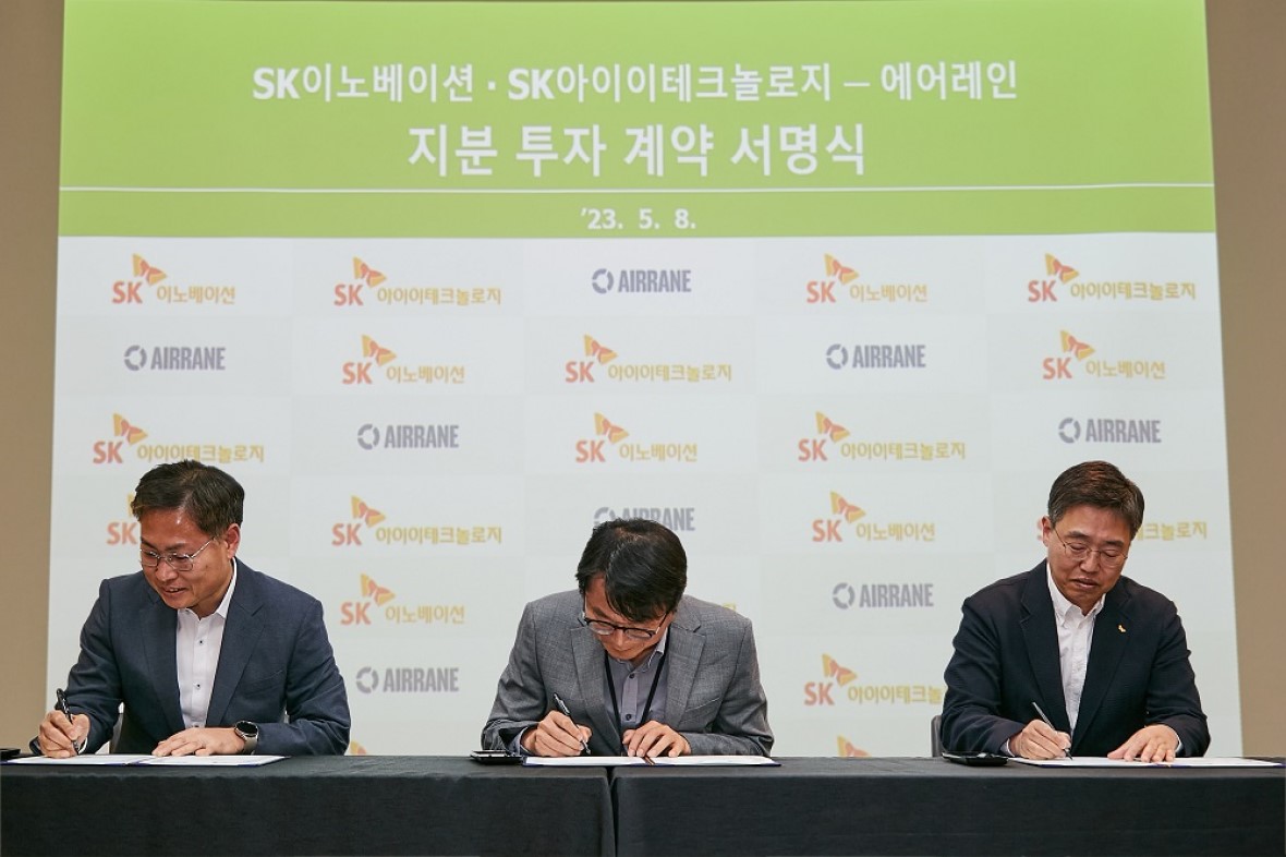 (Photo 1) Head of SK Innovation Portfolio Divisional Group Kang Dong-soo, President of Airrane Ha Seong-young, and Head of Biz Model Innovation Office Lee Byung-in are signing investment contracts.
