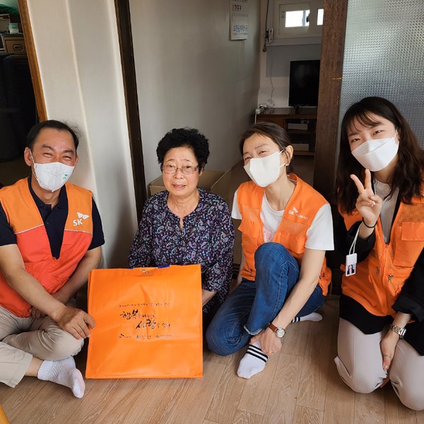 To tackle this, in 2016 SK Innovation affiliates decided to include “supporting the elderly living alone” as a major theme of their company-wide CSR activities. Among various programs related to this theme, “Sharing Happiness, Carrying on Love” is a regular volunteer program participated by many SK Innovation members every year to bring love and warmth to the seniors who stay alone. Due to the pandemic, the program was suspended in a while, but this year it has finally resumed. From the third week of May to the second week of June this year, together with the local social workers, the company members and leaders volunteered to visit the elderly living alone. The volunteers brought gifts, cleaned the seniors’ houses, and shared heart-warming time talking together.