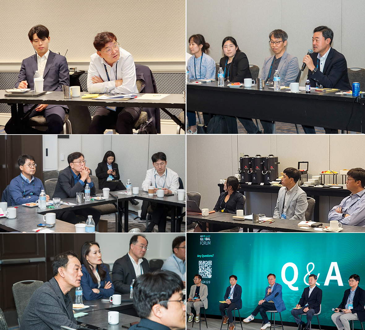 ▲ Various sessions were held at 2023 SK Innovation Global Forum with the participation of the company key execitives: (Clockwise from tom left) SK Geo Centric CEO Na Kyung-soo attended Recycle session / SK On CEO Jee Dong-seob attended Secondary Battery session / SK Incheon Petrochem CEO Choi Yun-seok attended Recycle session / Q&A session / SK Earthon CEO Myeong Seong attended Geo-Tech Net Zero Biz session / SK Enmove CEO Park Sang-kyu and SK Trading International CEO Suh Sok-won participated in Geen Transition session