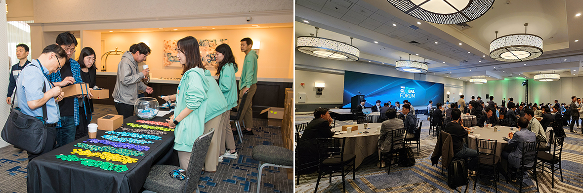 ▲ (Left) Participants pick up badges while entering the venue of 2023 SK Innovation Global Forum / (Right) Participants gather in the main hall of 2023 SK Innovation Global Forum